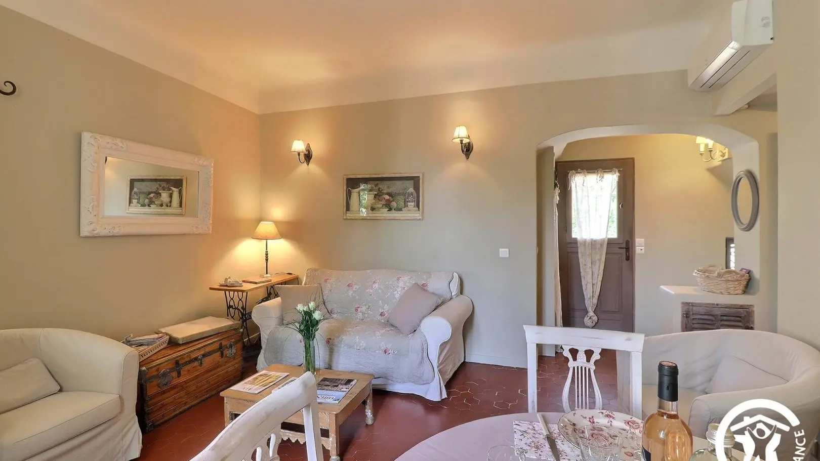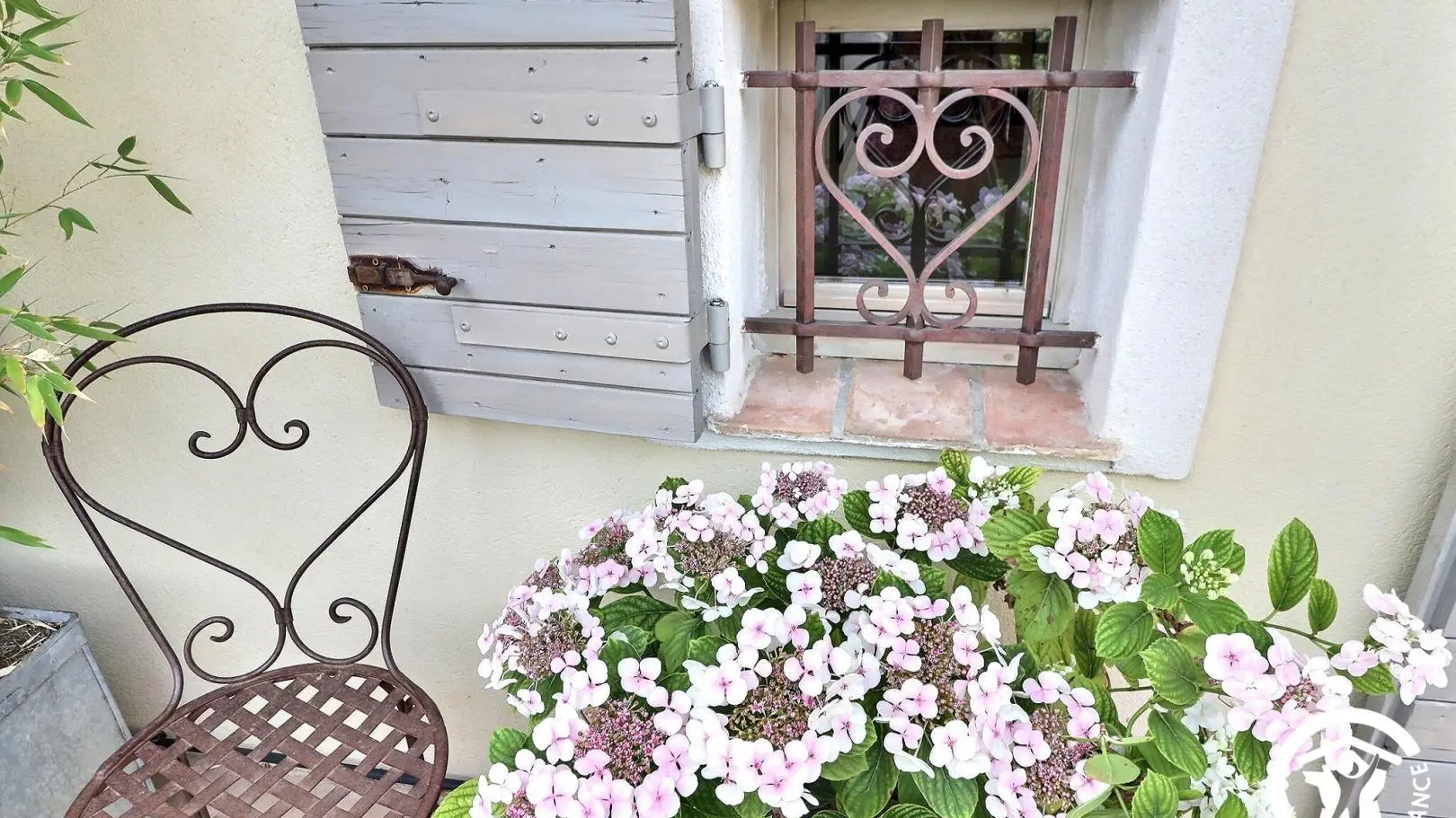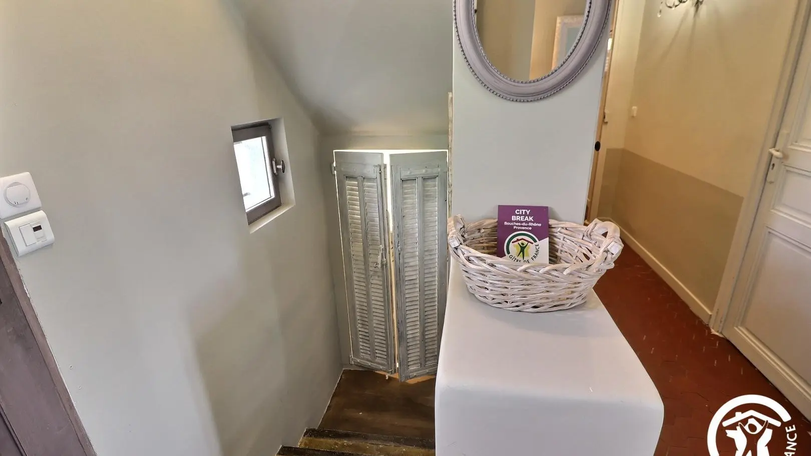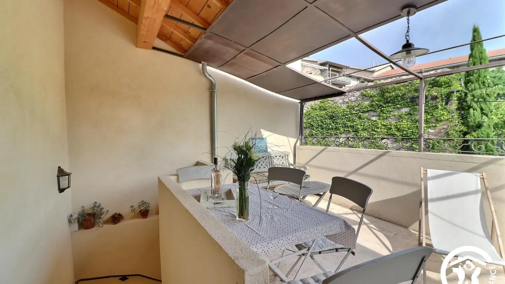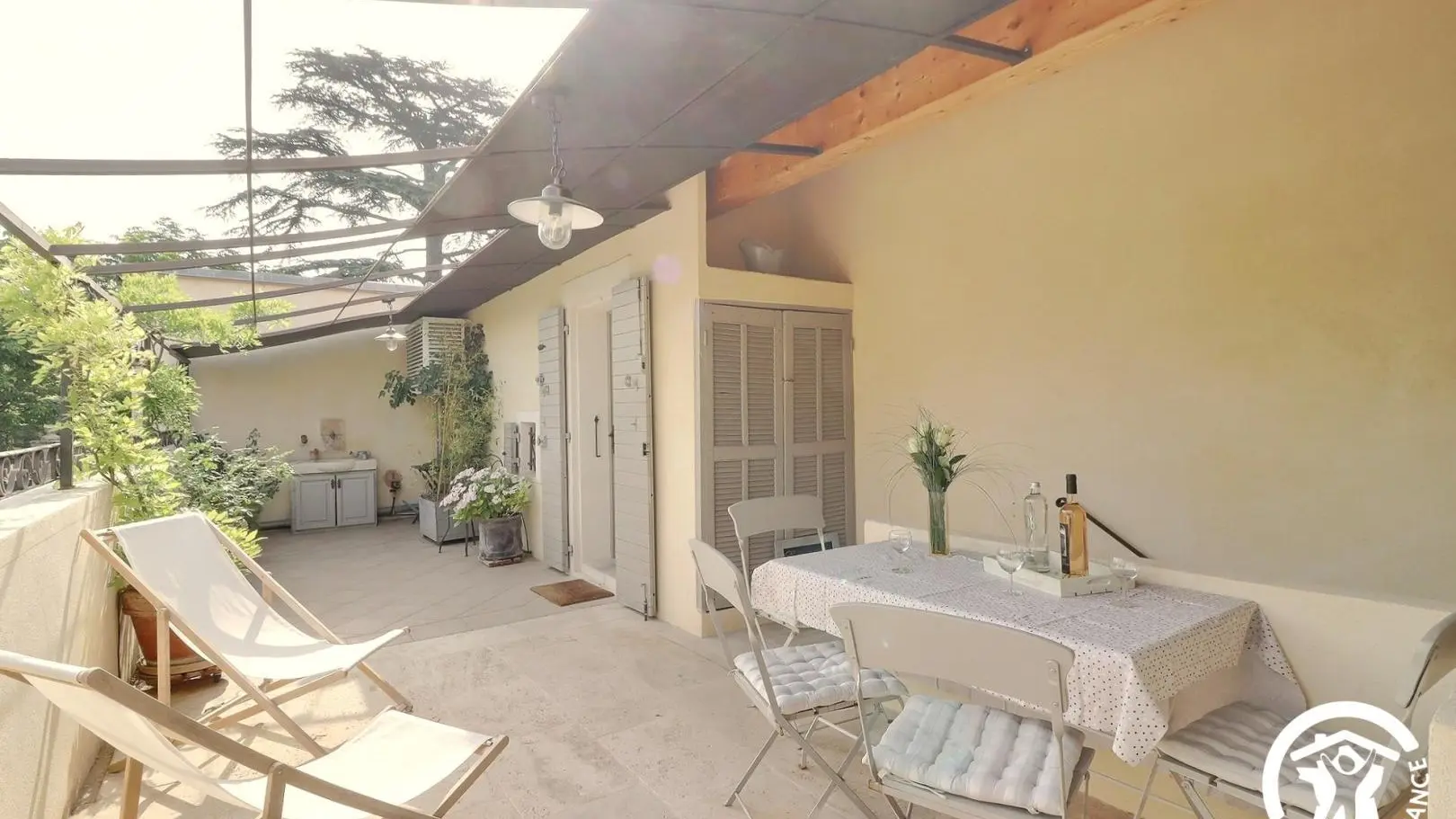 La Clématite est située au premier étage, accessible par un escalier donnant sur la belle terrasse. Au rdc se trouve la maison familiale des propriétaires.