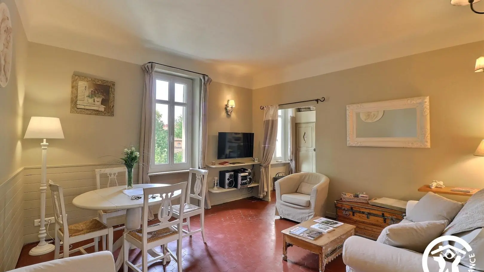 - Salon avec canapé, deux fauteuils, table basse, malle, TV connectée, table et 4 chaises.