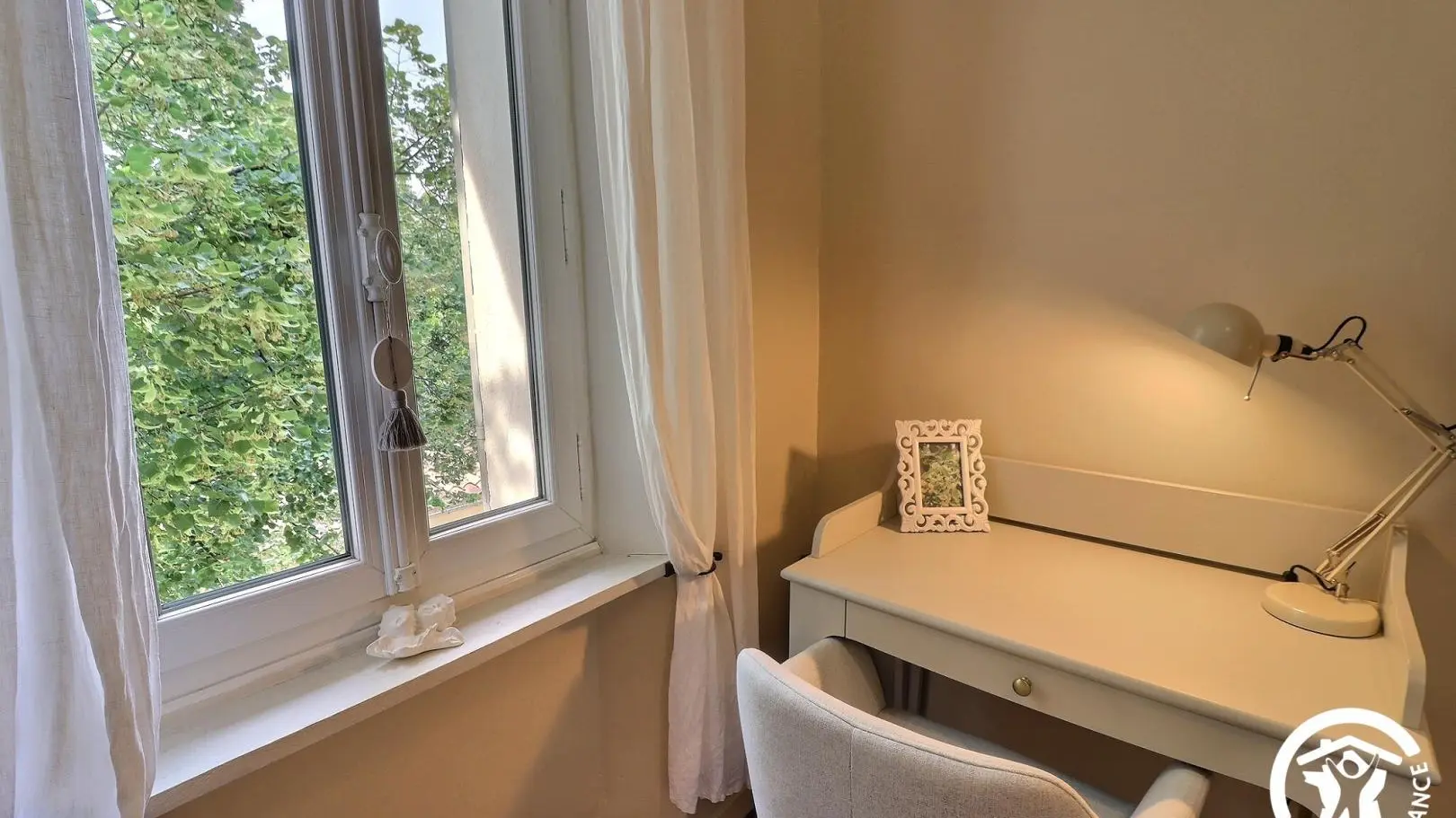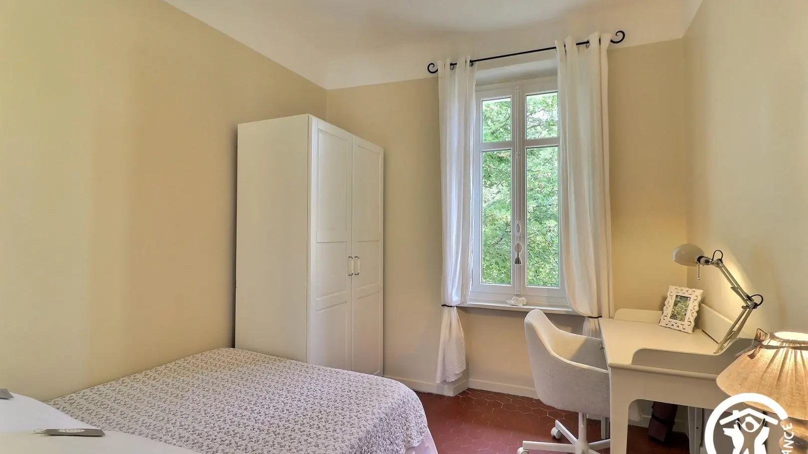 - Chambre double avec lit 140x190cm, bureau avec lampe et fauteuil, armoire penderie. Fenêtre donnant sur une vue jardin.