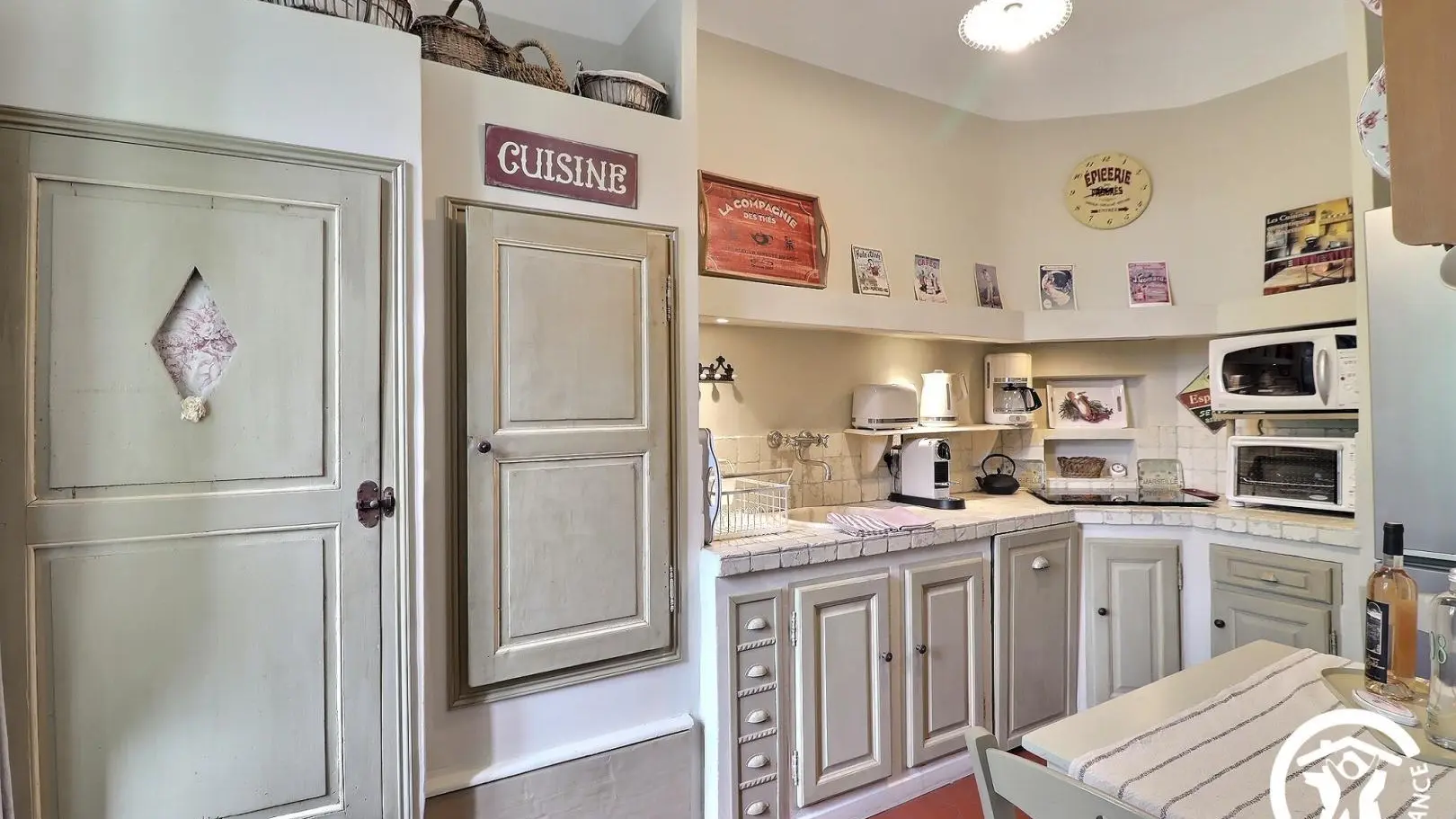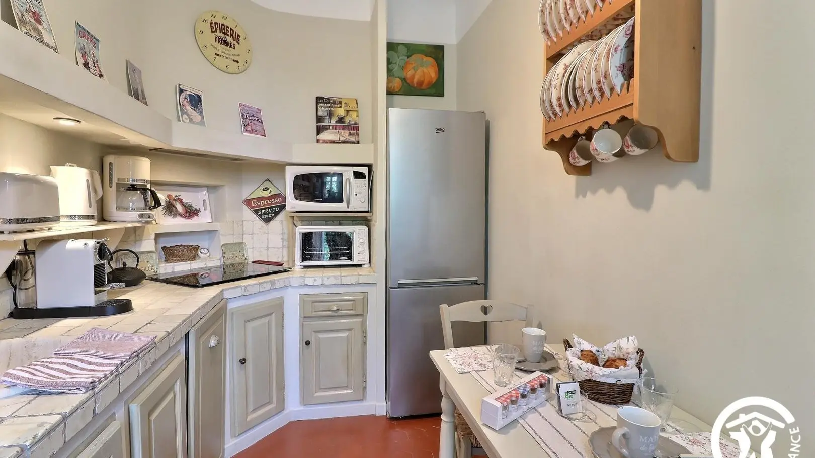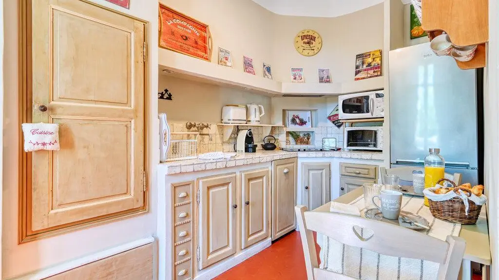 - Coin cuisine ouvert sur le salon avec réfrigérateur/congélateur, 4 feux induction, hotte aspirante, micro-ondes, mini-four, lave-vaisselle, nombreux appareils électroménager. Table avec 2 chaises pour le petit déjeuner.