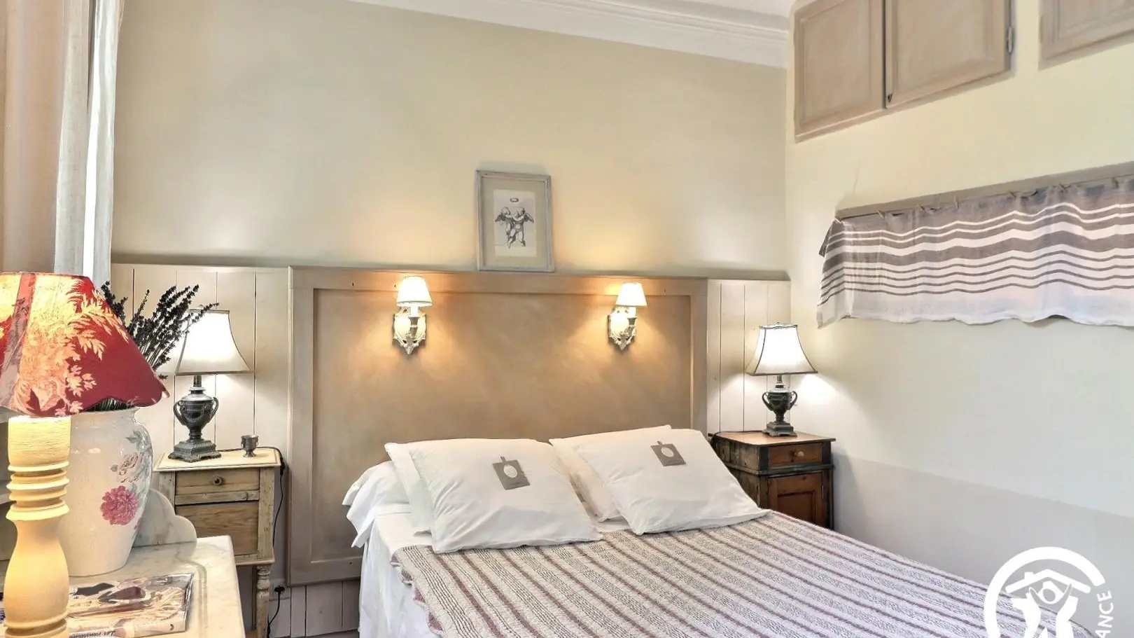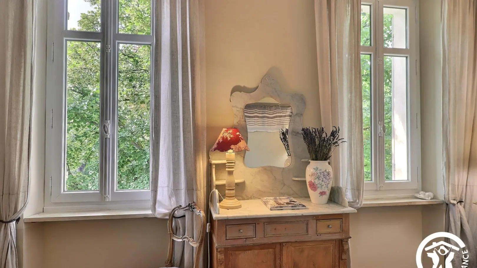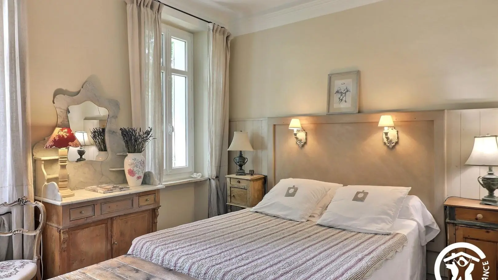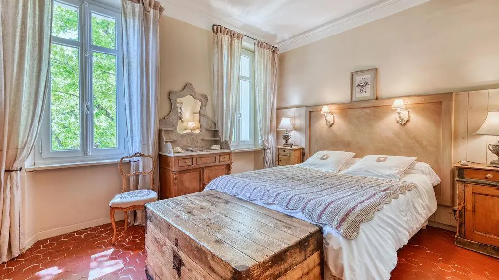- Chambre double avec lit 140x200cm, coiffeuse, malle, 2 placards intégrés. 2 fenêtres donnant sur une vue jardin.