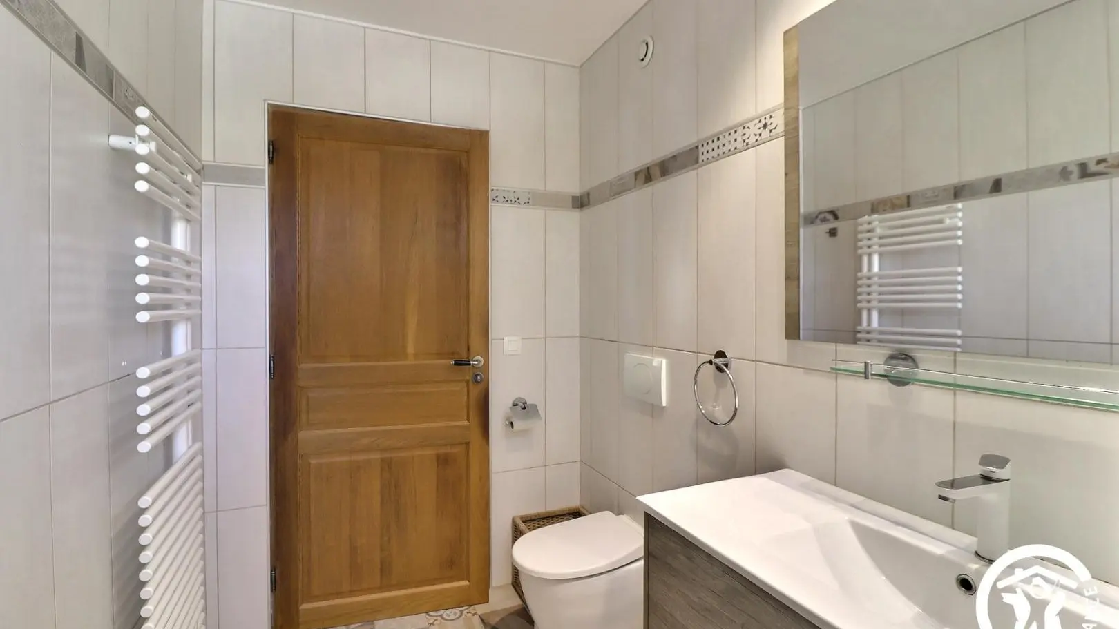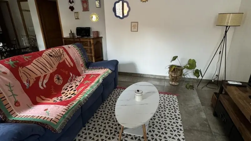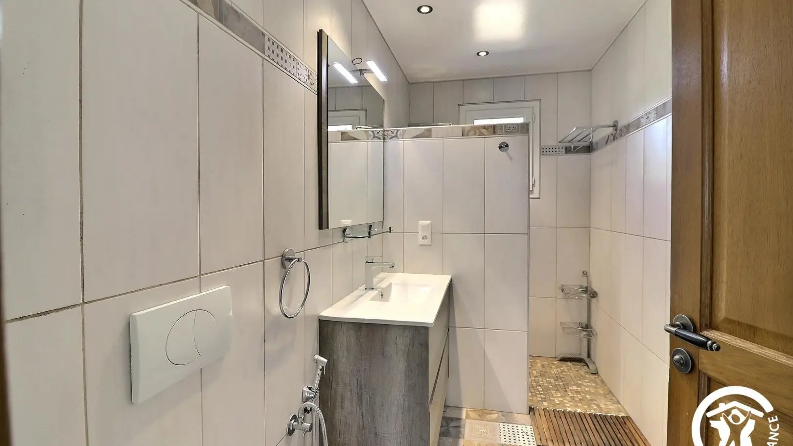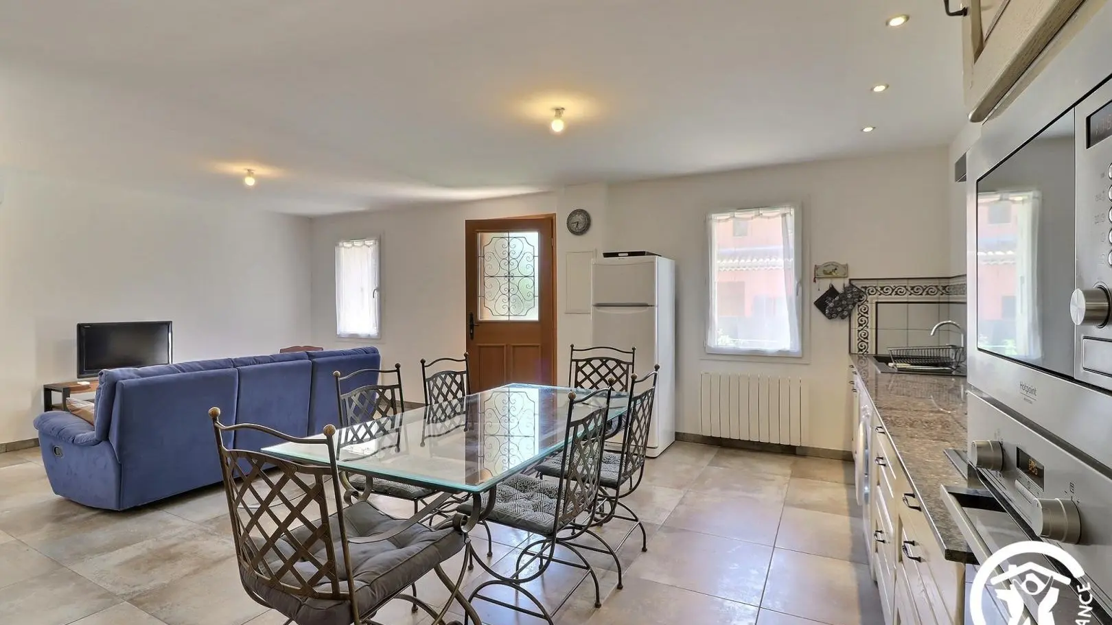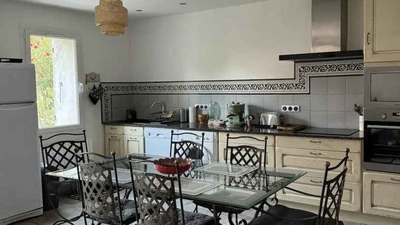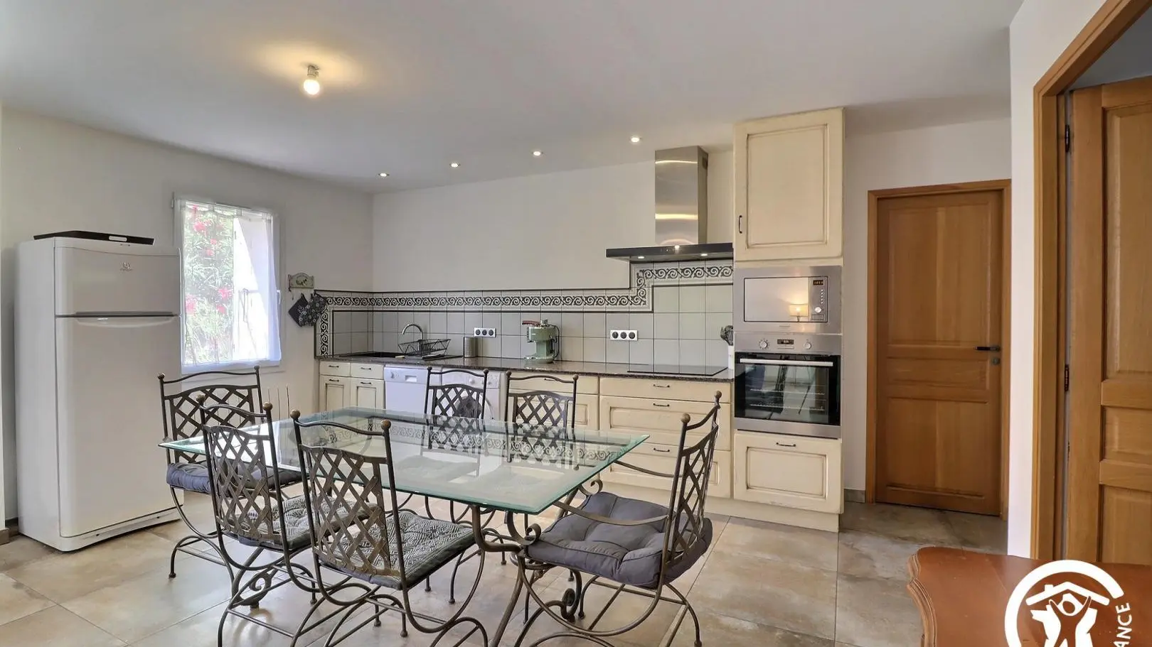- Cuisine équipée ouverte sur le salon/salle à manger : lave-vaisselle, lave-linge, 4 feux induction, hotte aspirante, four, micro-ondes, réfrigérateur/congélateur. Table et 6 chaises, canapé, fauteuil, table basse, TV. Climatisation réversible. Grand placard de rangement.