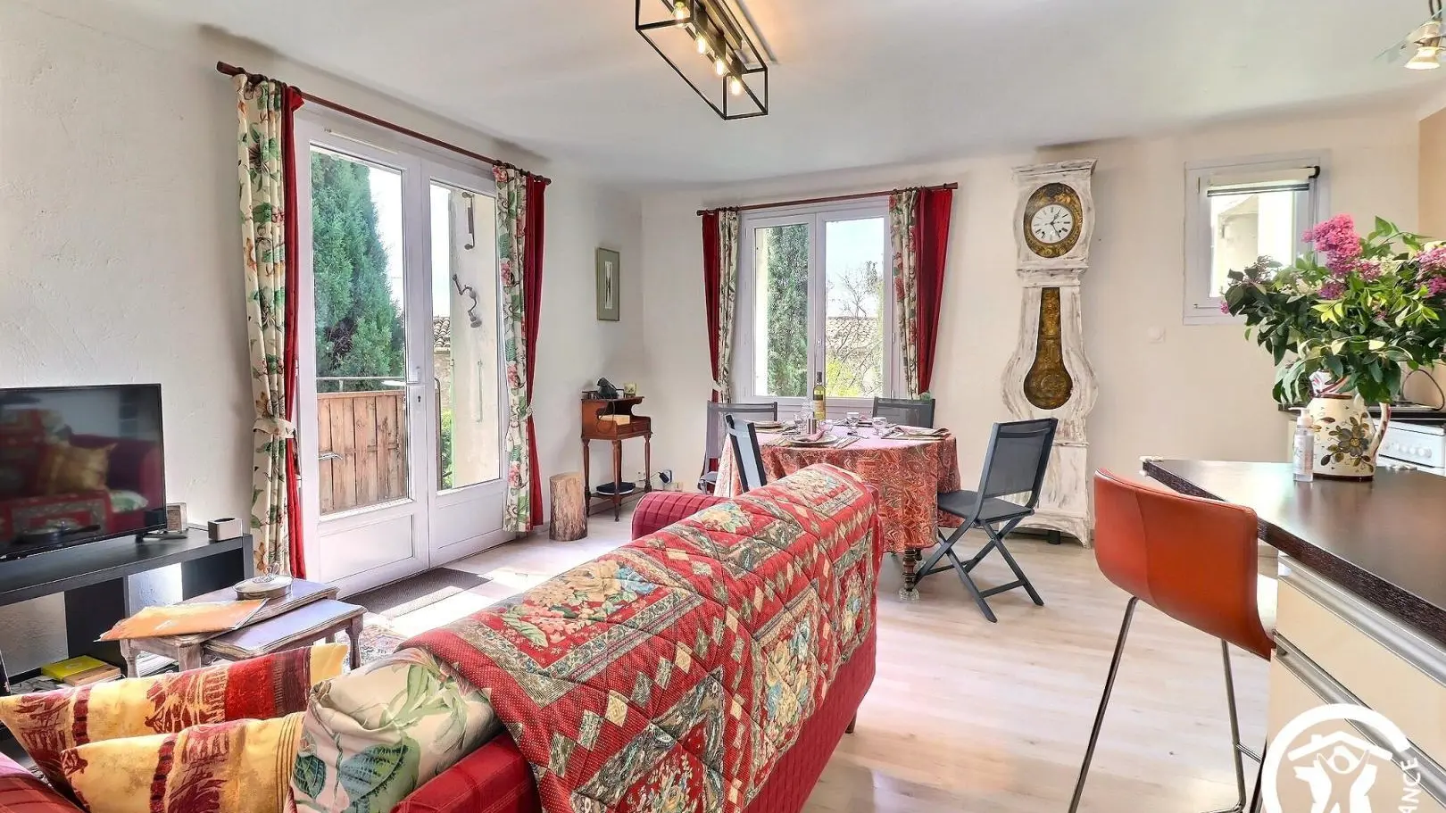 Pièce de jour avec salon (canapé, table basse, TV écran plat), espace repas, cuisine ouverte équipée (four, hotte aspirante, plaque 4 feux vitrocéramique, micro-ondes, réfrigérateur/congélateur, lave-vaisselle) avec coin bar.
