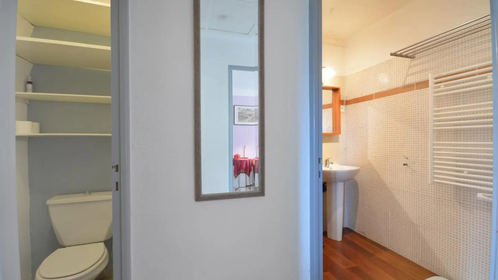 Couloir desservant les 2 chambres (une chambre avec 1 lit 2 personnes 160x200cm et une chambre avec 2 lits 1 personne 90x190cm) avec accès direct à la terrasse privative, la salle d'eau avec grande douche 100x85cm, vasque et porte-serviettes chauffant et les WC séparés. Terrasse privative sans vis-à-vis de 13 m² fleurie avec salon de jardin.