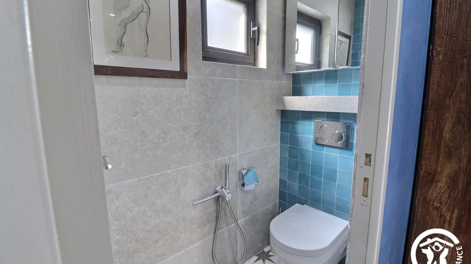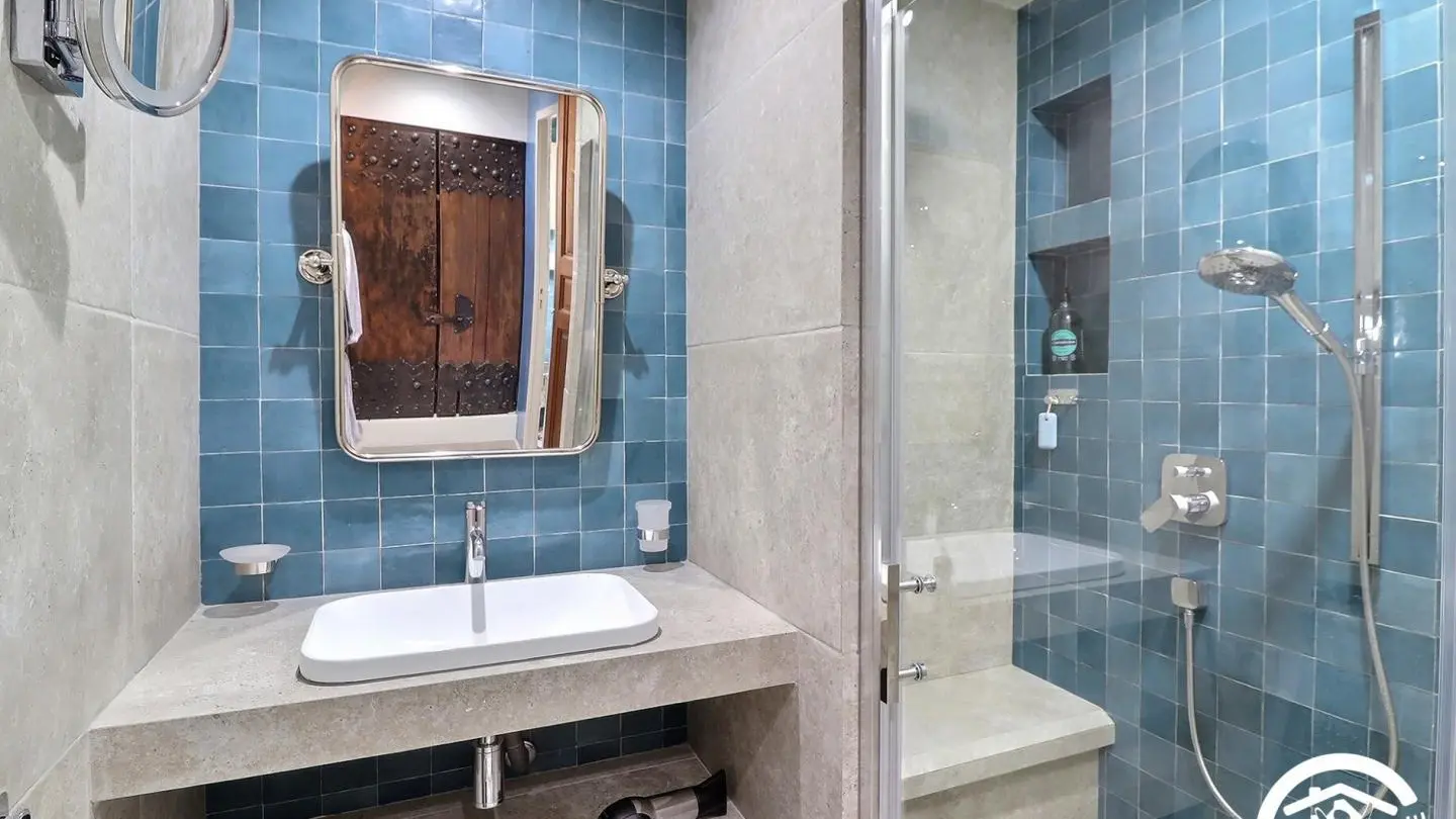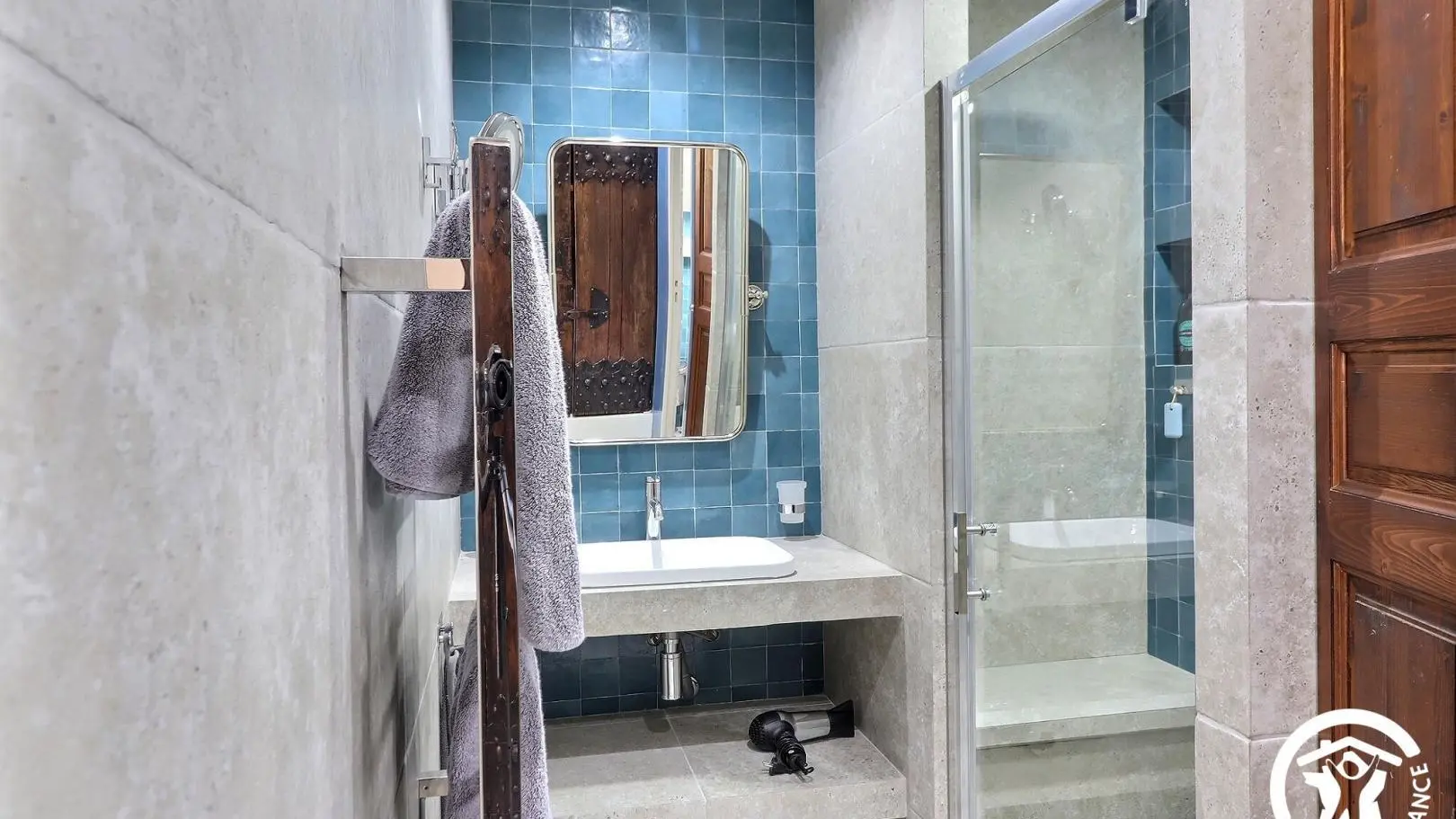 Salle d'eau ouverte sur la chambre avec douche 90x150cm, vasque avec rangements, sèche-serviettes, placard avec lave-linge. WC indépendant avec douchette.