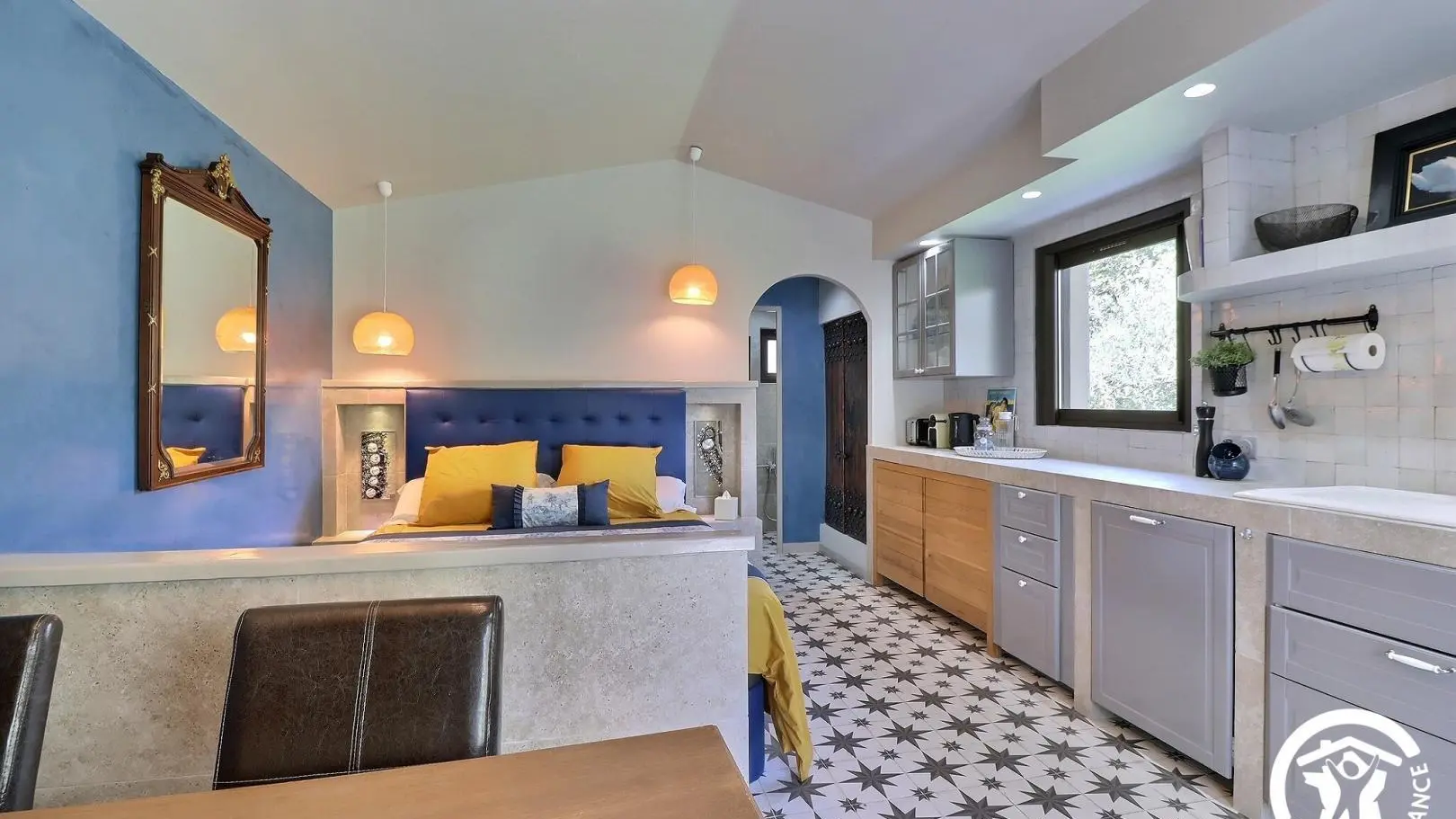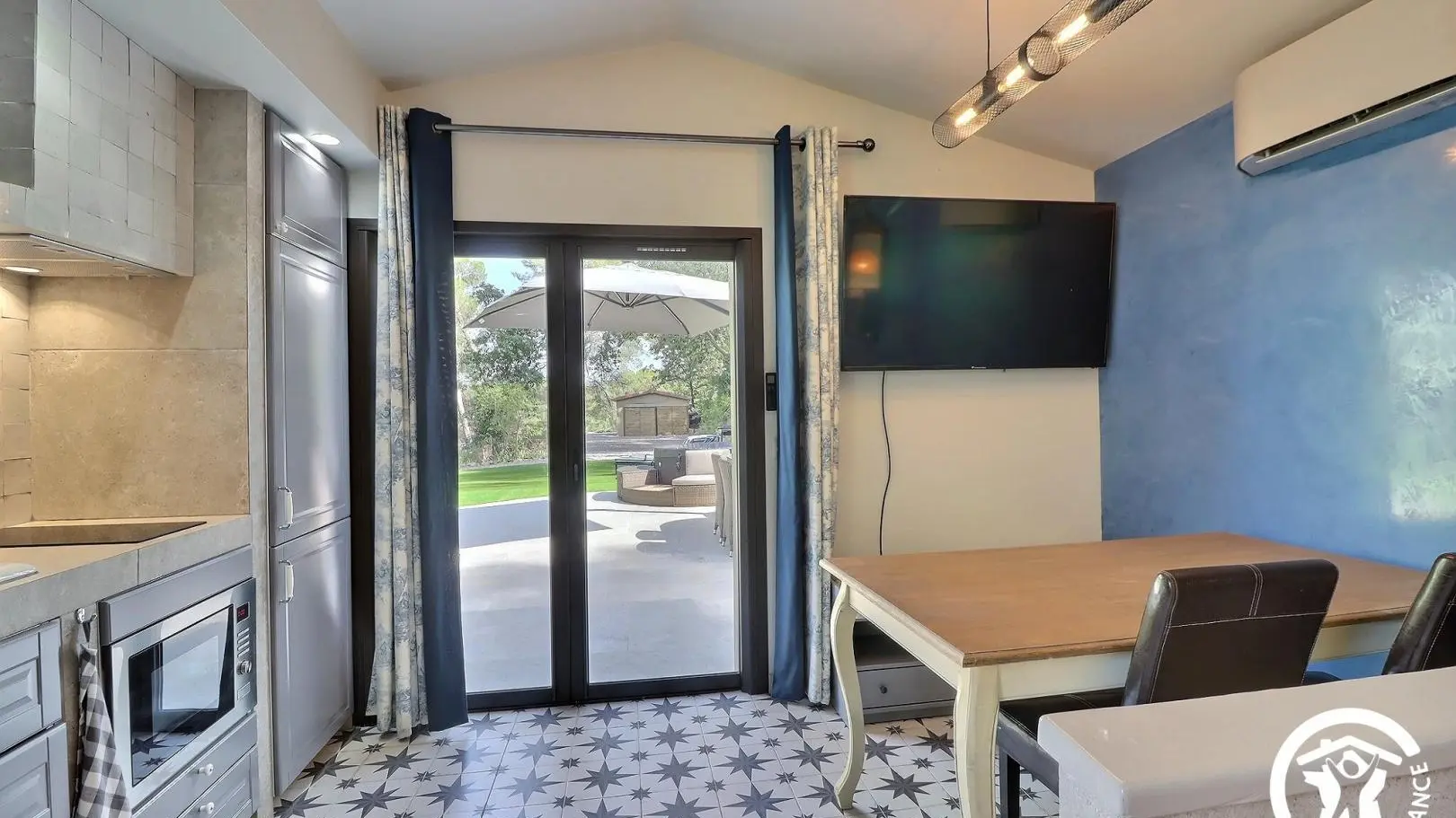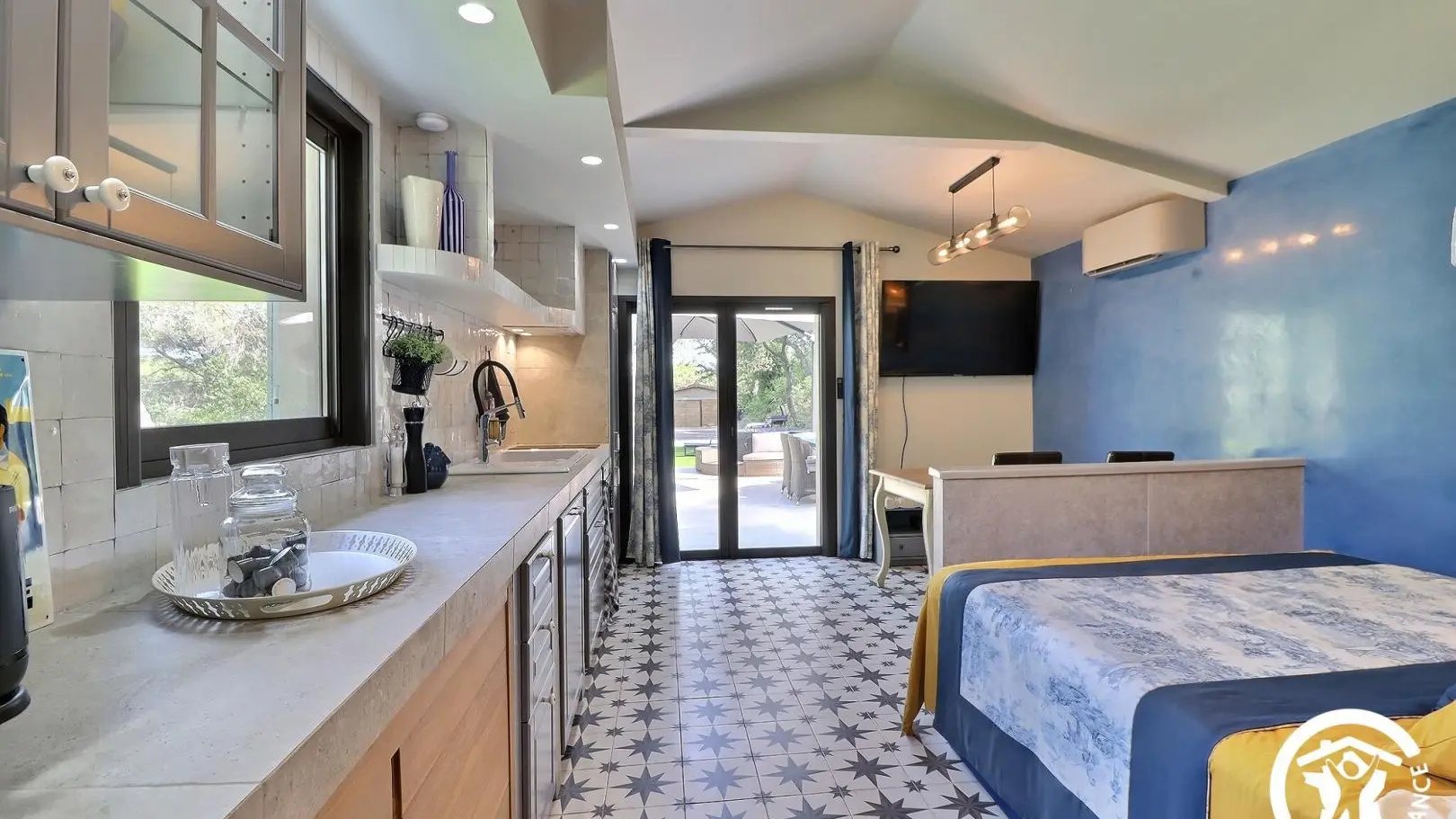 Pièce de vie climatisée avec coin repas (table, chaises et banc), grande TV connectée, cuisine ouverte équipée (réfrigérateur/congélateur, combiné four/micro-ondes, lave-vaisselle, petit électroménager), lit 160x200cm.