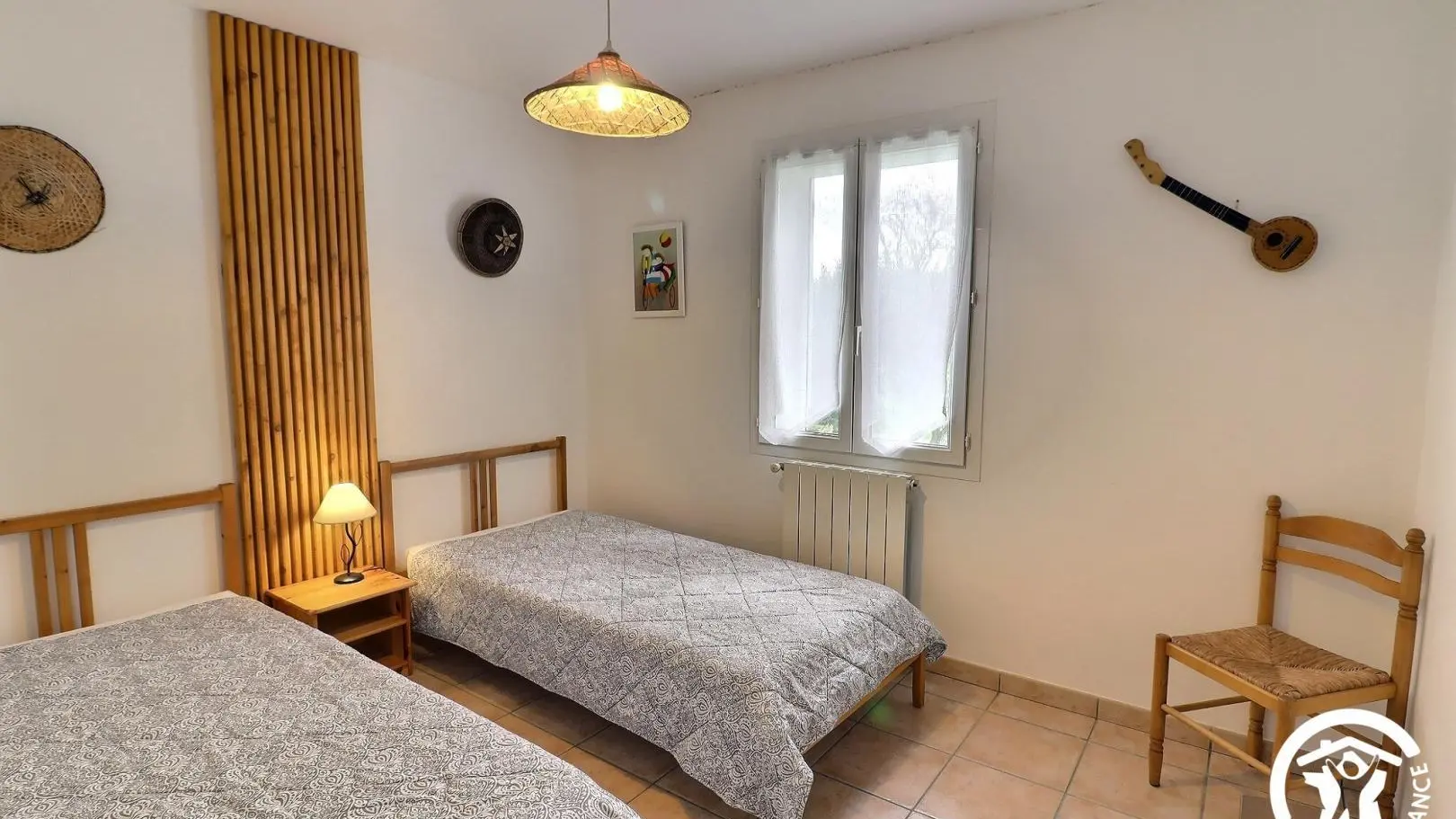 De plain pied, le gîte est composé d'une pièce de vie avec cuisine équipée ouverte sur l'espace repas avec une plaque 4 feux gaz, four électrique, hotte aspirante, micro-ondes, réfrigérateur/congélateur, lave-vaisselle, bouilloire, cafetière et grille-pain. Salon avec canapé, TV écran plat, 2 fauteuils et table basse. Espace repas avec une table et 4 chaises, bibliothèque. Une chambre avec 2 lits 1 personne 90x190cm, et une chambre avec 1 lit 2 personnes 140x190cm. Salle d'eau avec douche 100x100cm et vasque. WC séparés.