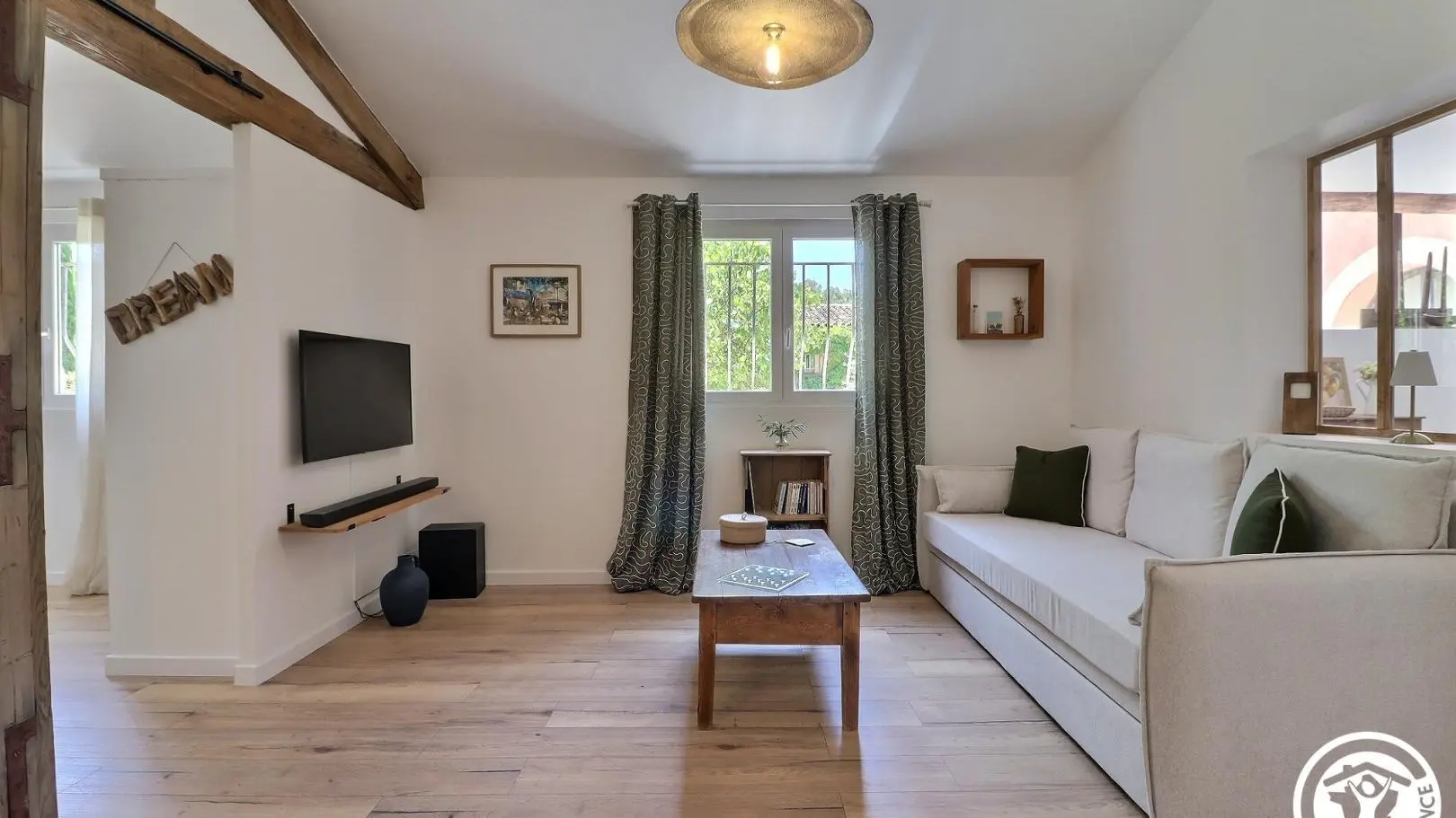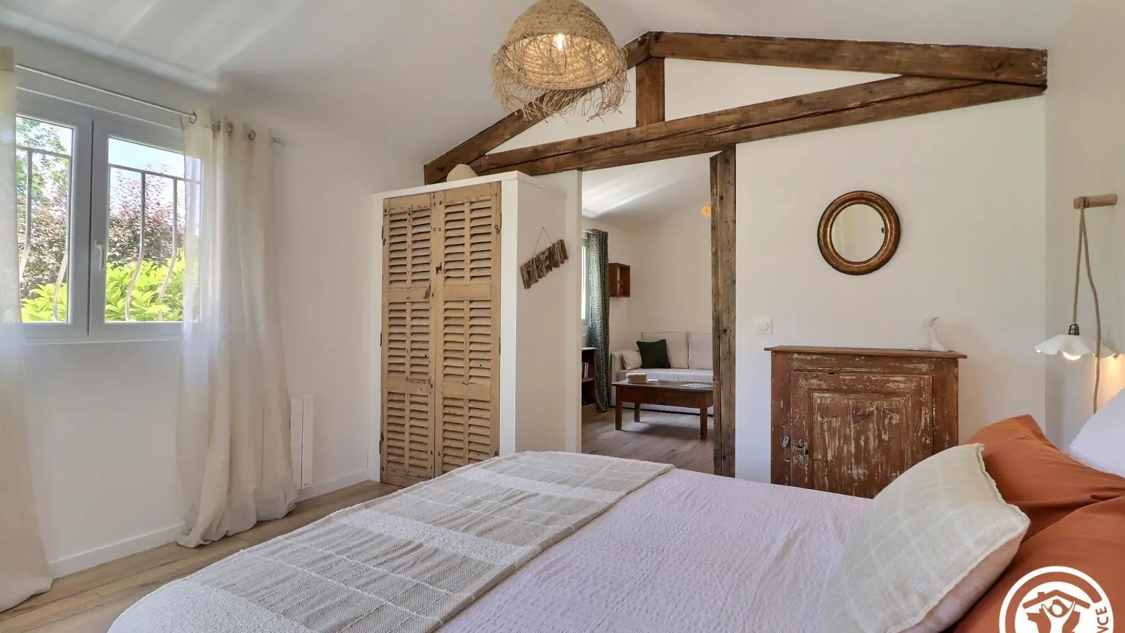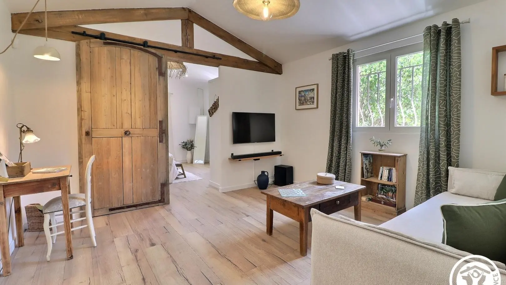 L'intérieur séduit par son cachet et sa fonctionnalité : une chambre séparée par une élégante porte ancienne à galandage, dotée d'un lit 2 personnes 160x200cm, rangements, miroir en pied et fauteuil, ainsi qu'un salon équipé d'un canapé convertible (160x200cm déplié, couchage d'appoint supplémentaire possible pour 2 personnes supplémentaires avec supplément de 10€ par personne et par nuit), TV écran plat avec Apple TV et barre de son, coin bureau, petite bibliothèque et climatisation réversible.
