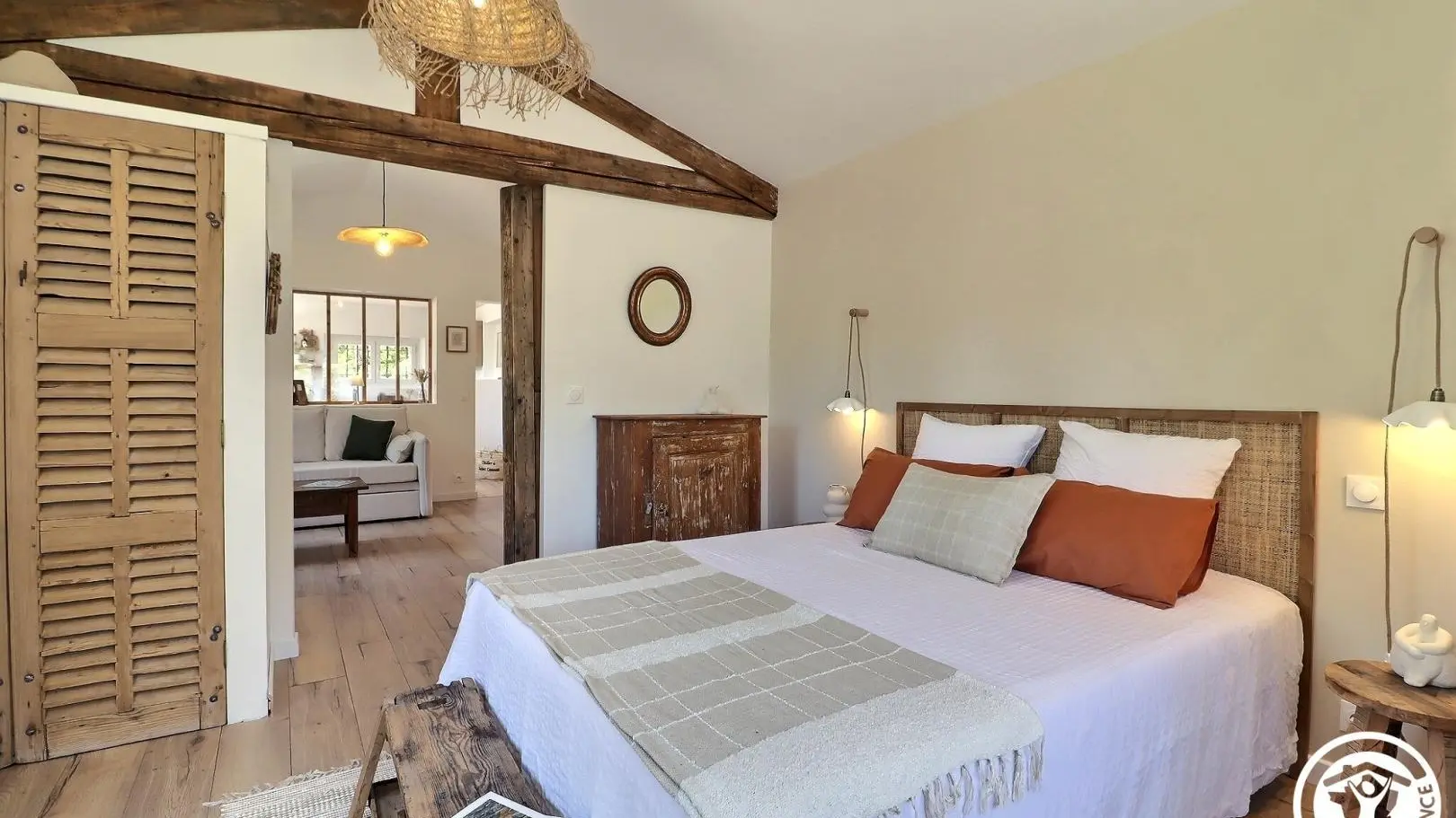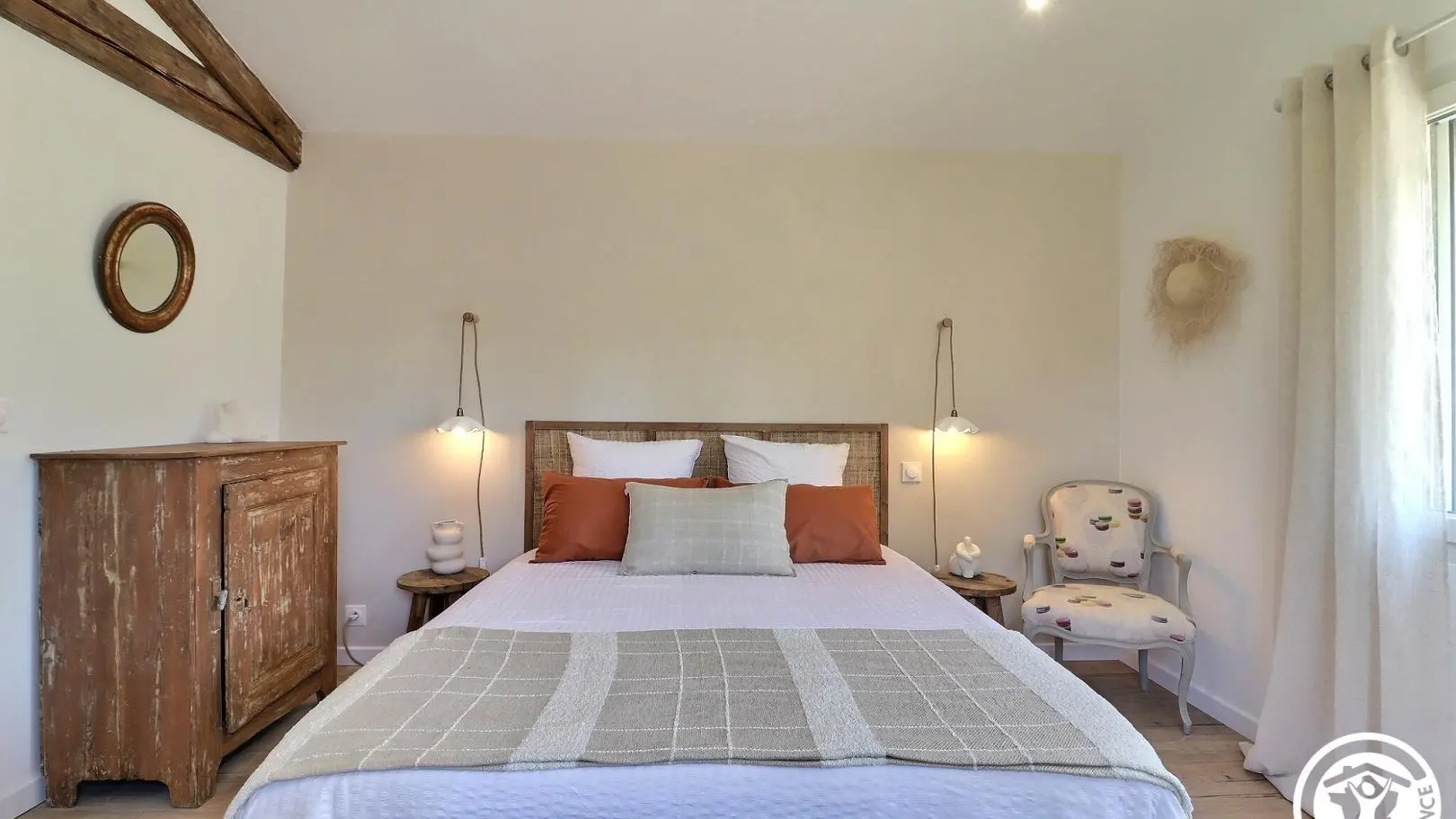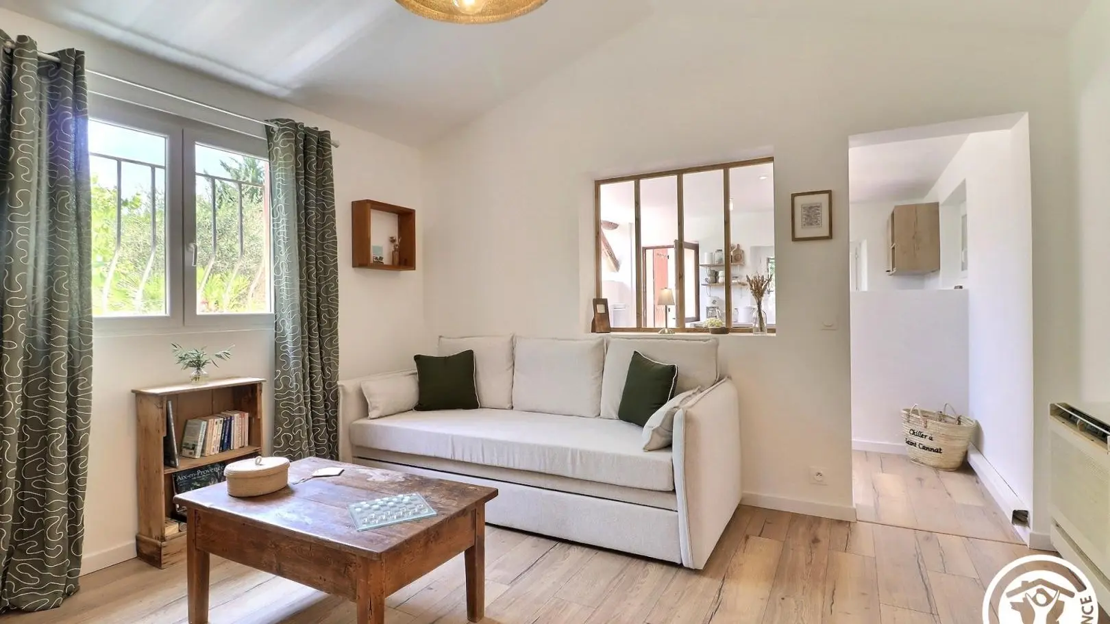 L'intérieur séduit par son cachet et sa fonctionnalité : une chambre séparée par une élégante porte ancienne à galandage, dotée d'un lit 2 personnes 160x200cm, rangements, miroir en pied et fauteuil, ainsi qu'un salon équipé d'un canapé convertible (160x200cm déplié, couchage d'appoint supplémentaire possible pour 2 personnes supplémentaires avec supplément de 10€ par personne et par nuit), TV écran plat avec Apple TV et barre de son, coin bureau, petite bibliothèque et climatisation réversible.