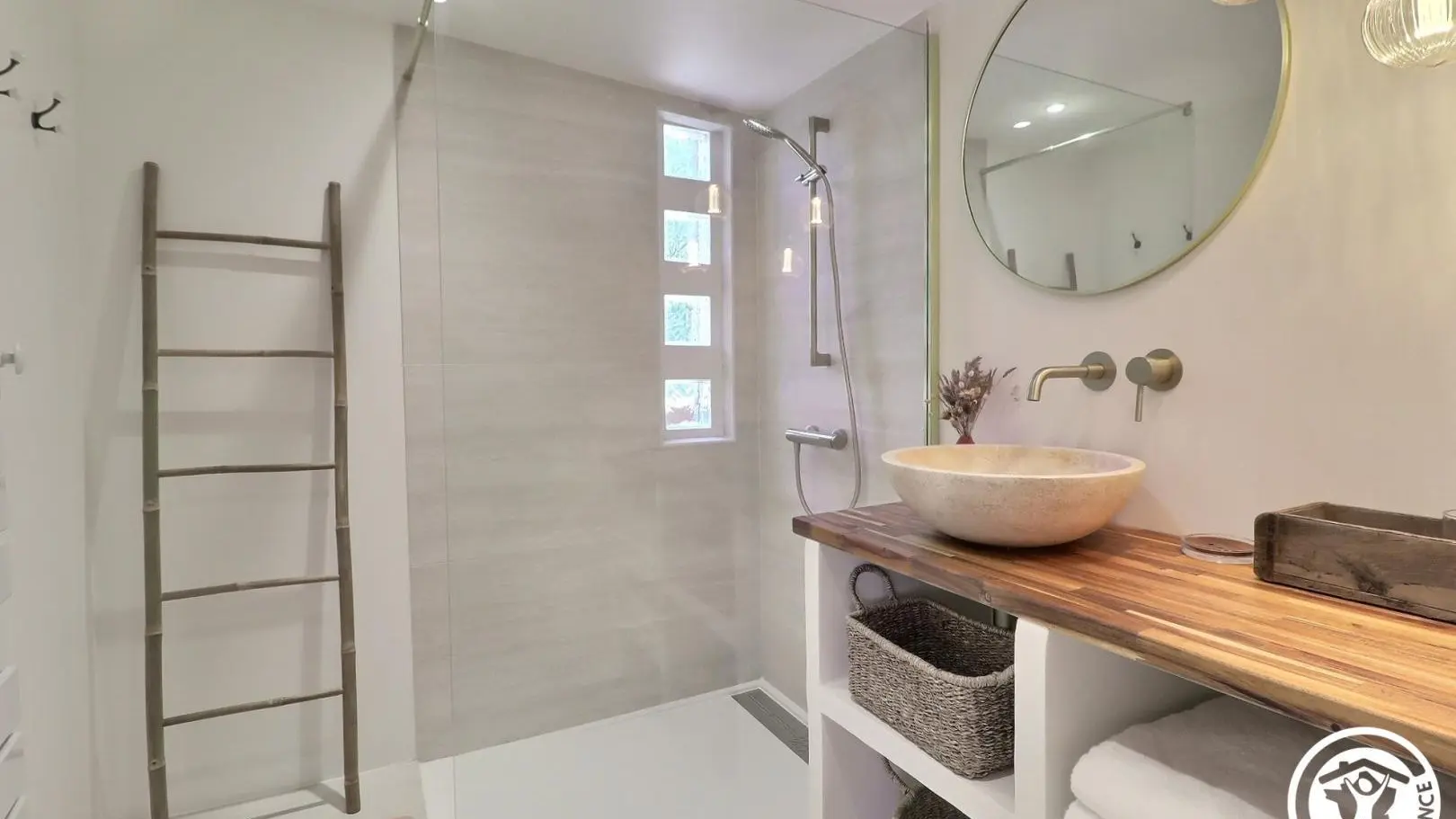 La salle d'eau offre une grande douche à l'italienne, vasque et porte-serviettes chauffant. WC indépendant.