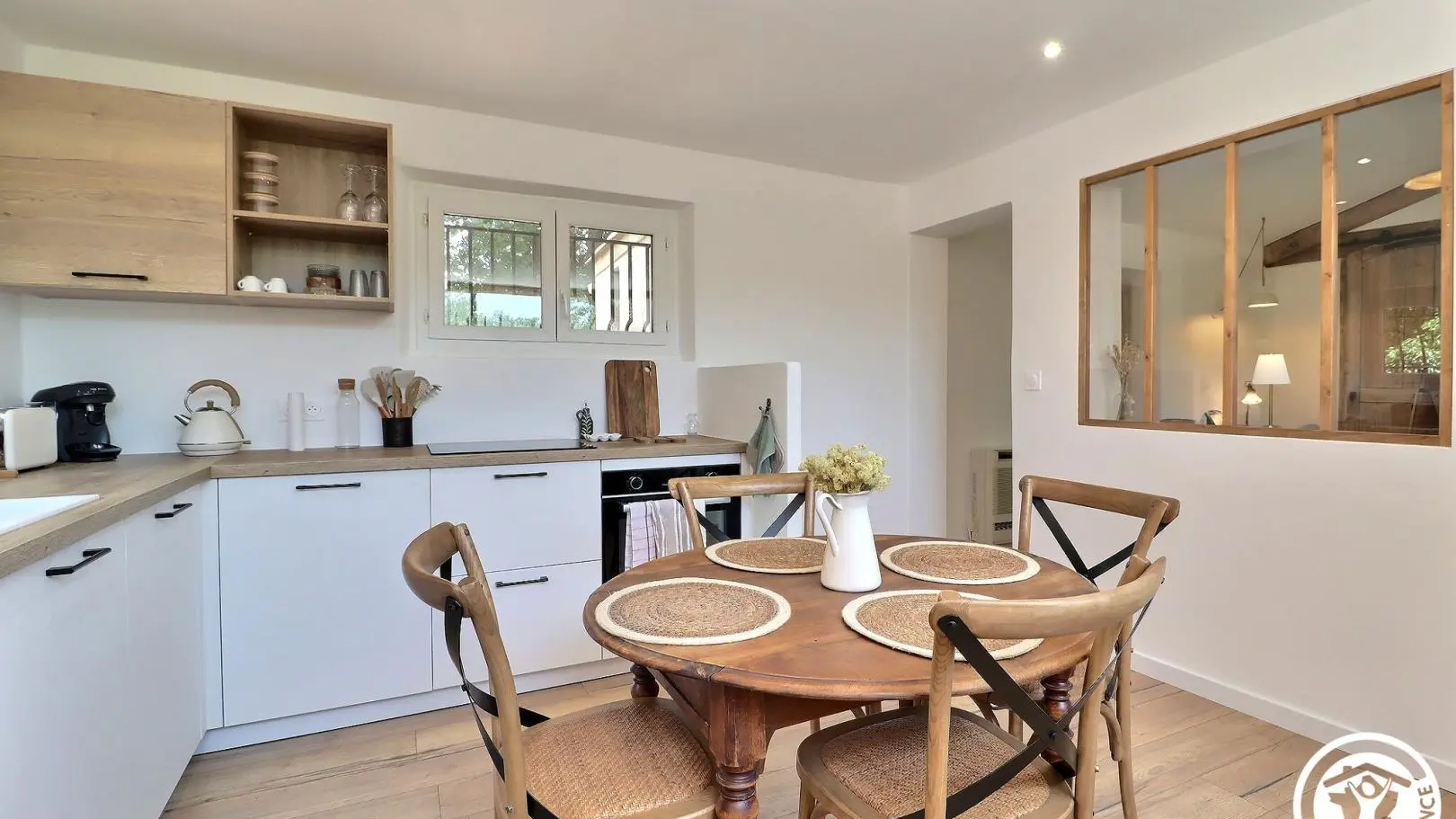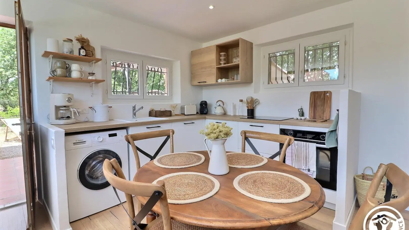La cuisine moderne avec verrière propose tout le confort souhaité (lave-vaisselle, lave-linge, four, micro-ondes, plaque induction, réfrigérateur/congélateur) et un espace repas.