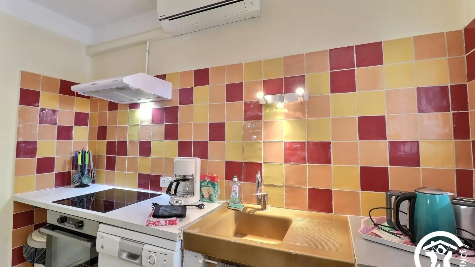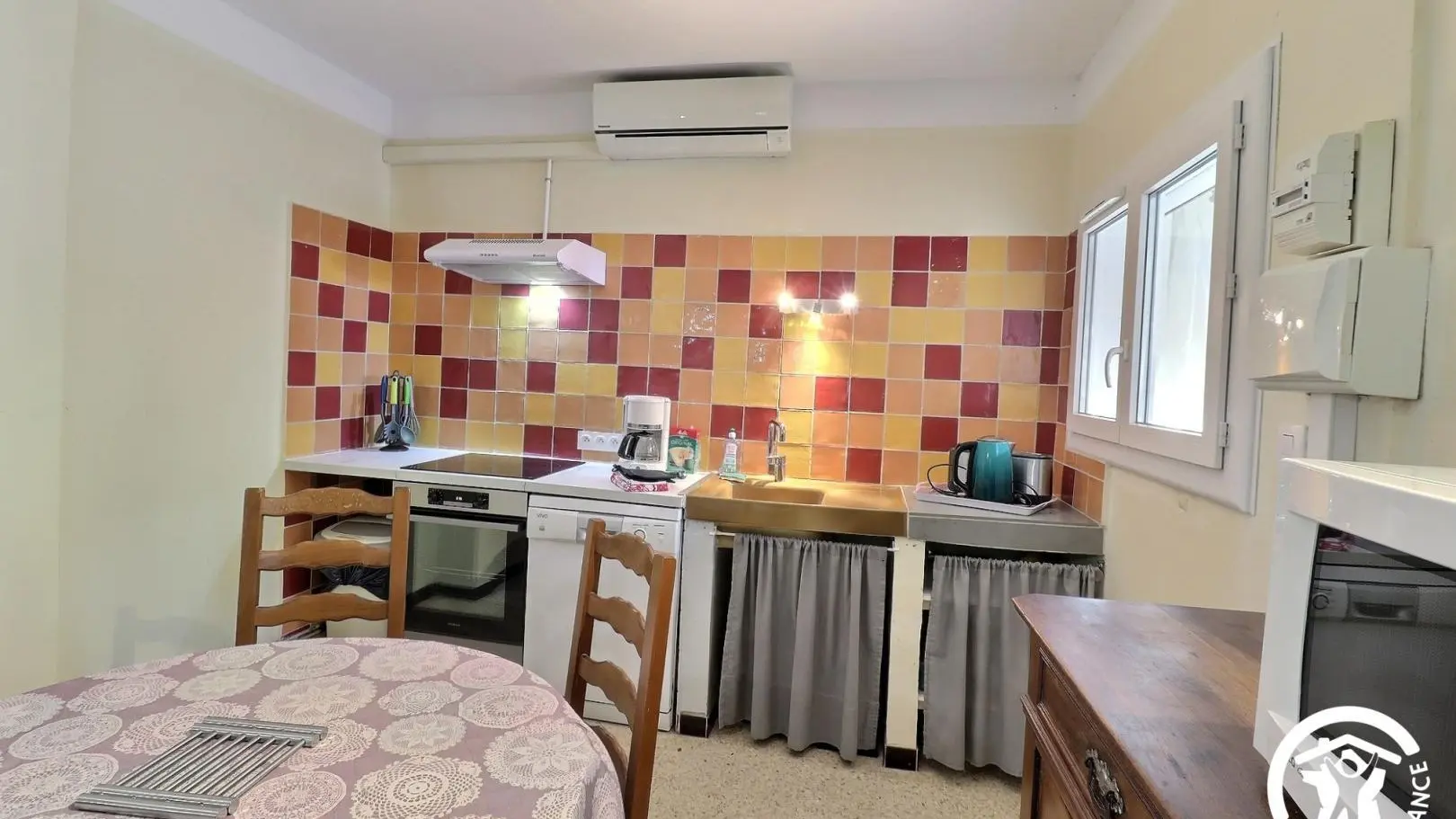 - Séjour avec espace repas pour 4 personnes, cuisine ouverte (plaque induction, four électrique, micro-ondes, réfrigérateur/congélateur, lave-vaisselle), buffet et petite bibliothèque.