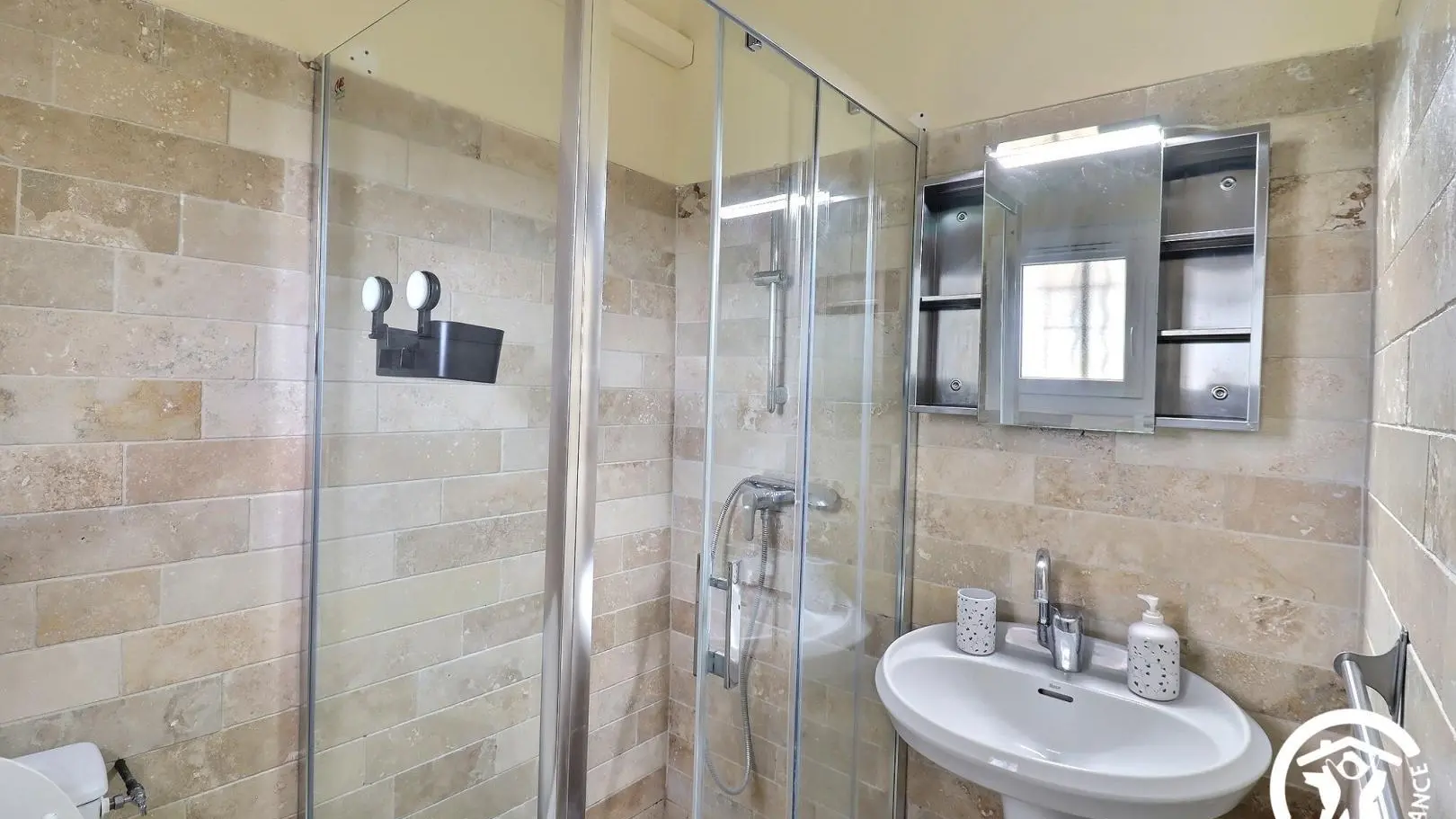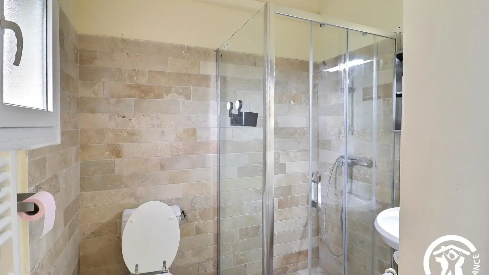 - Salle d'eau accessible via la chambre avec douche à l'italienne, WC, vasque et porte-serviettes chauffant.