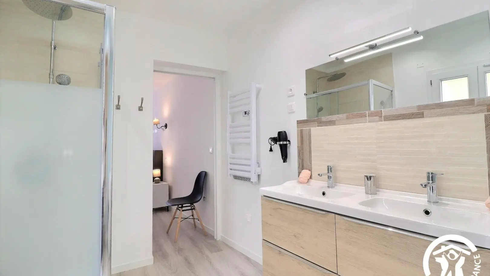 - Salle d'eau privative pour cette chambre avec double vasque, WC, douche à l'italienne 120x80cm et porte-serviettes chauffant. Accès à une petite cour/balcon intérieur d'environ 4 m².