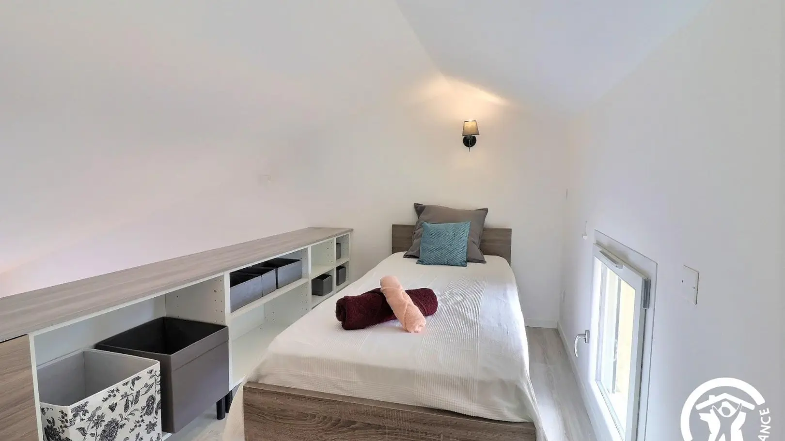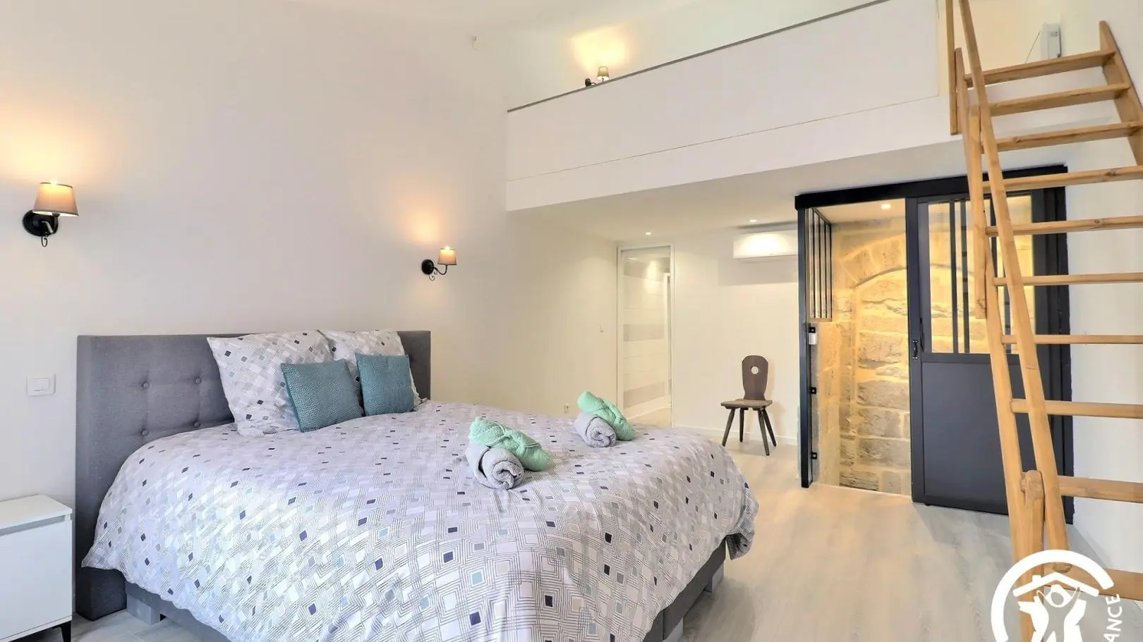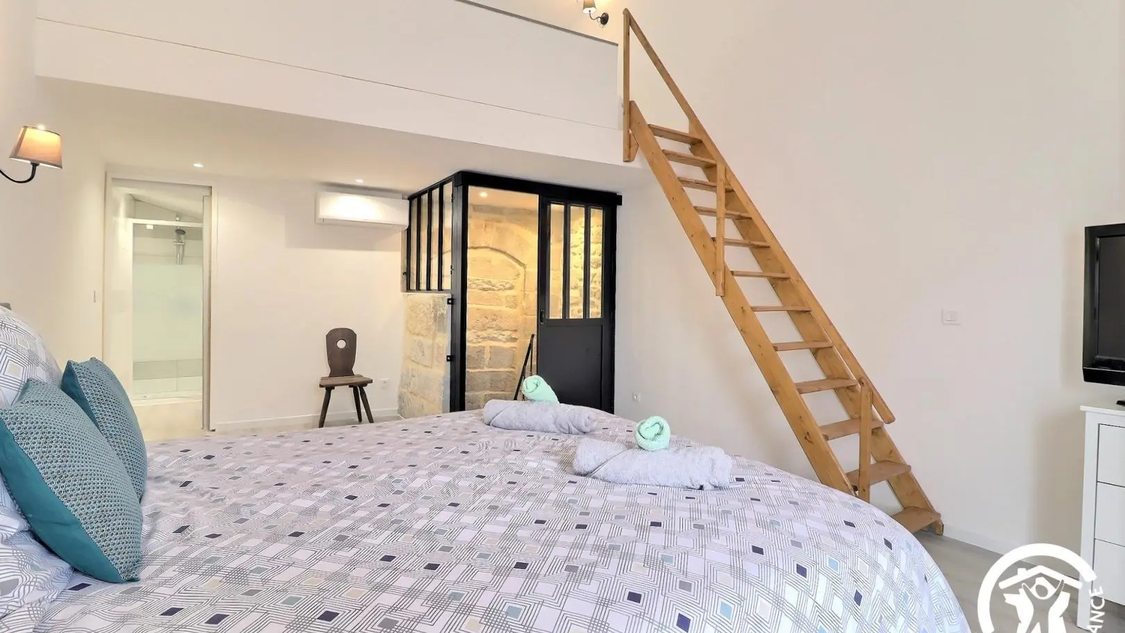 - 2ème chambre avec un lit 2 personnes 160x200cm, TV écran plat, escalier menant à la mezzanine avec un lit 90x190cm surplombant la chambre avec rangements. Vue sur les toits de Barbentane, l'église et les tours du château.