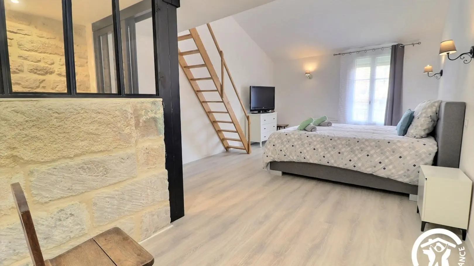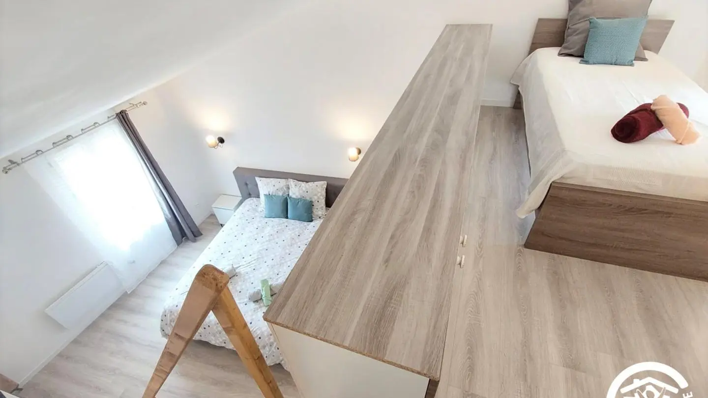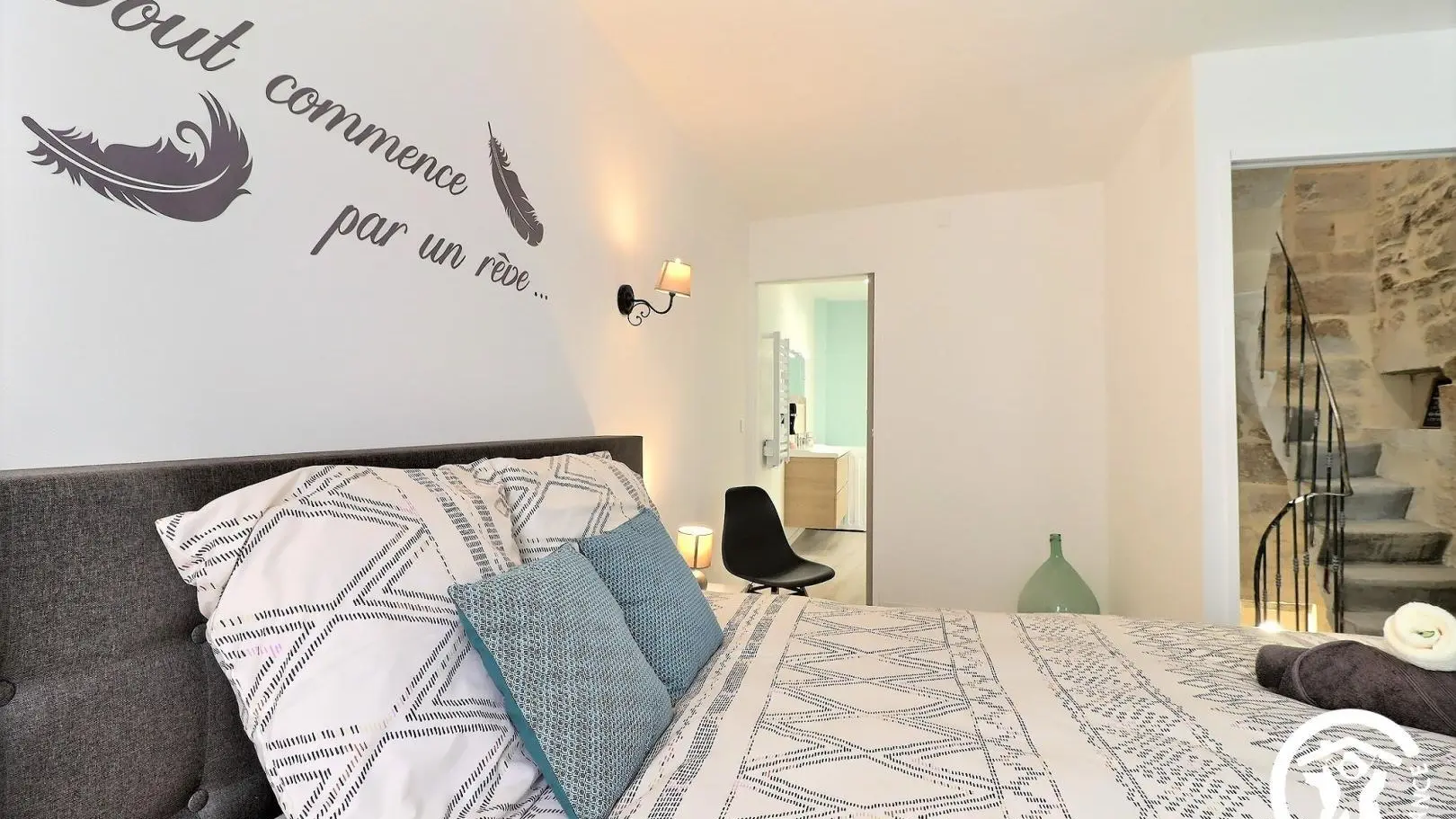 - 2ème chambre avec un lit 2 personnes 160x200cm, TV écran plat, escalier menant à la mezzanine avec un lit 90x190cm surplombant la chambre avec rangements. Vue sur les toits de Barbentane, l'église et les tours du château.