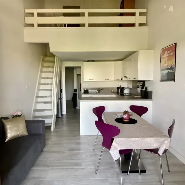 Situé dans une résidence avec parking privé, cet appartement est très bien équipé. Il dispose de 2 jolies chambres avec lits en 140, une située au 1er étage et l'autre en mezzanine fermée. La salle de bain est équipée d'une douche, un sèche serviette. La cuisine est toute équipée, four, micro-ondes, machine à café nespresso, lave-vaisselle et lave-linge.