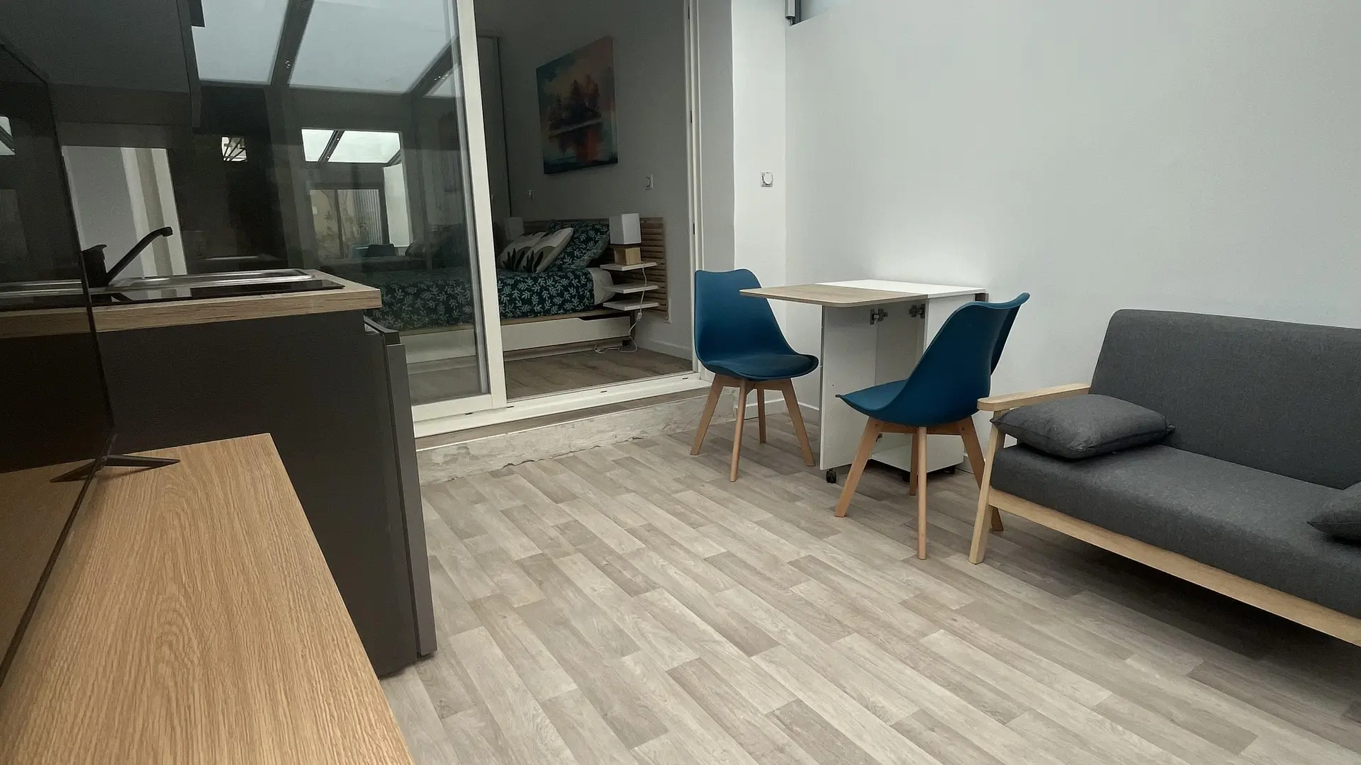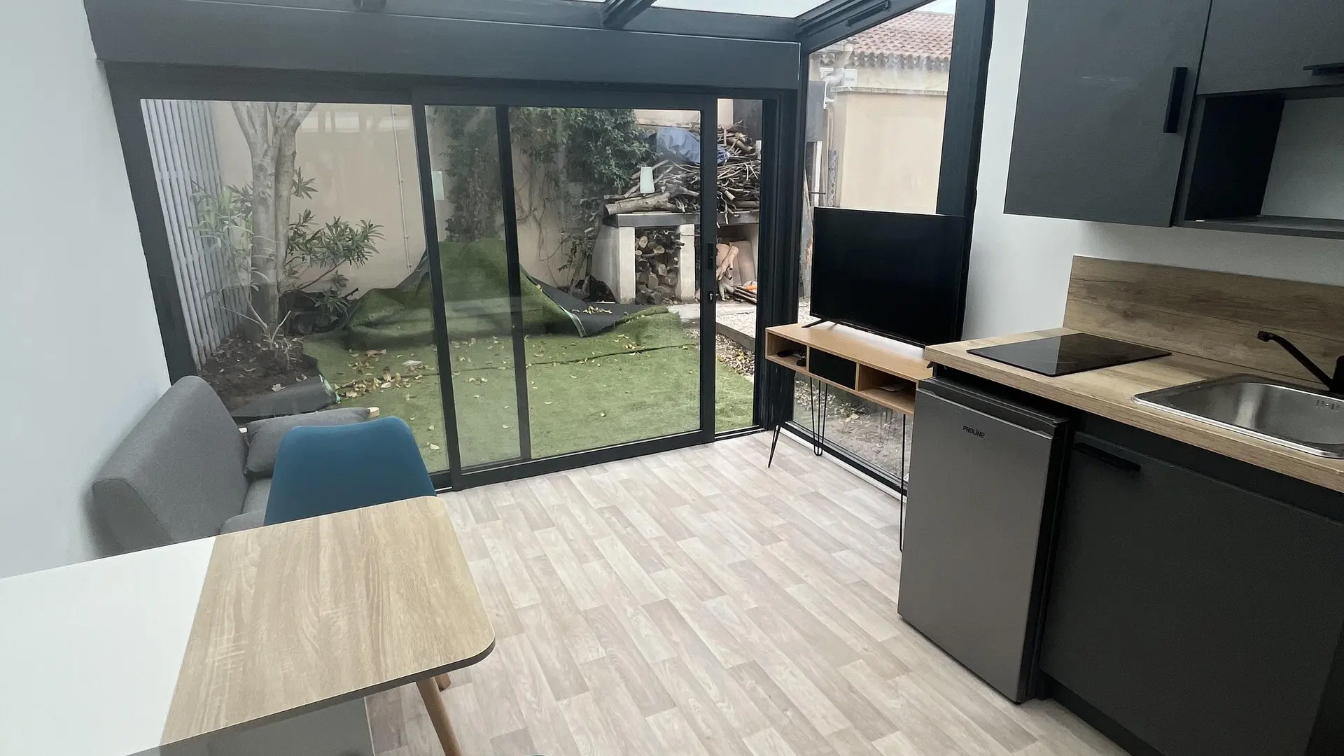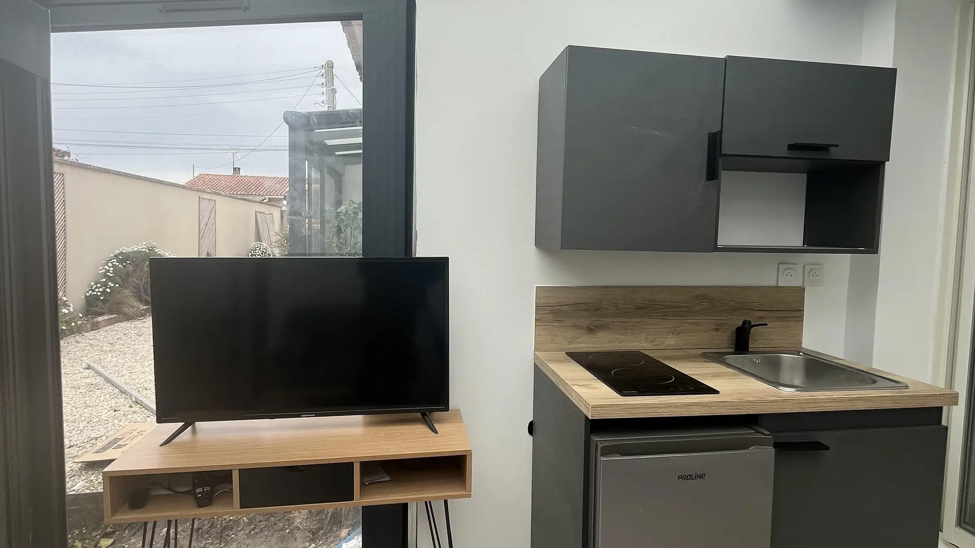 - Une petite cuisine et un espace repas table et chaises, (frigo, plaques de cuisson, bouilloire, machine à café dolce gusto, vaisselle et accessoires de cuisine etc...)