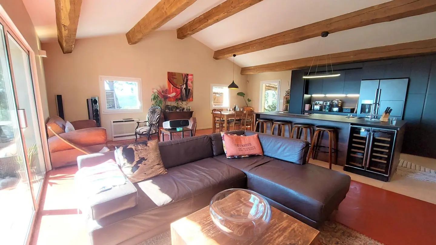 - Une belle pièce de vie avec poutres apparentes, 2 coins salons avec cheminée (bois fourni), vidéoprojecteur servant de TV avec accès aux chaînes de la box SFR (la connexion peut être aléatoire vu la localisation du gîte), canapés, fauteuils et enceinte connectée, espace repas pour 6. Belle cuisine équipée avec ilot central, plaque 4 feux induction, hotte intégrée, four, réfrigérateur/congélateur américain avec distributeur de glaçons, lave-vaisselle, micro-ondes, cafetière à percolateur et Magimix.
