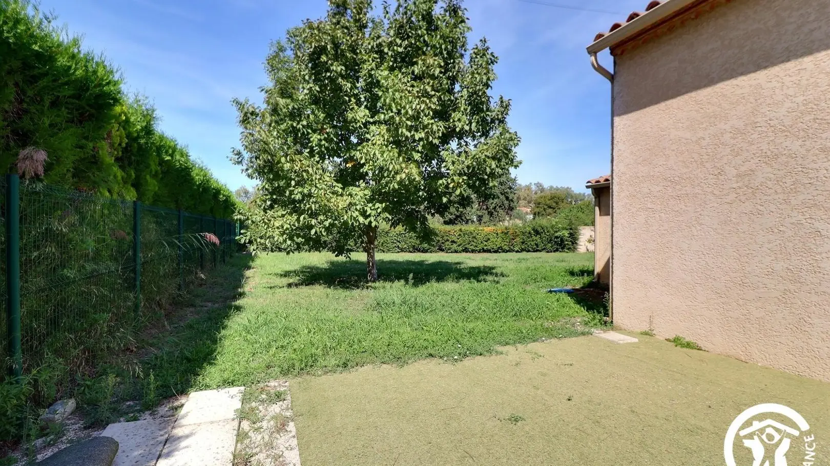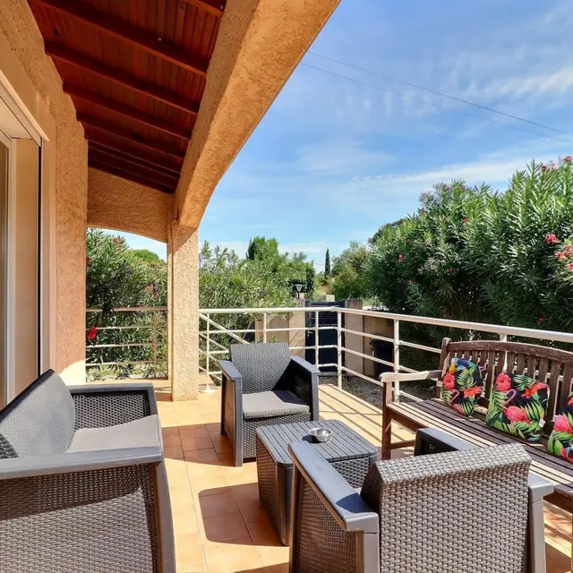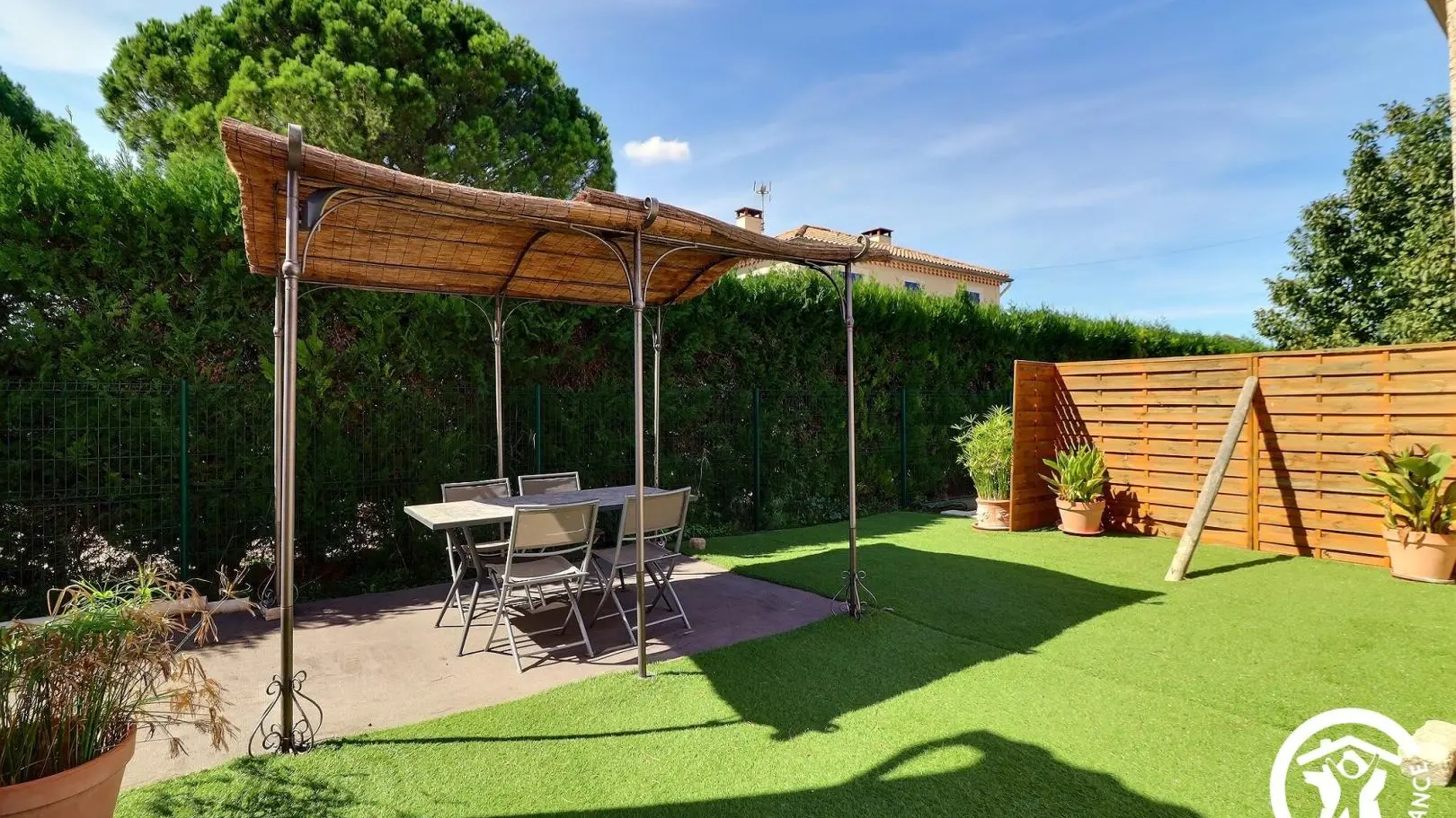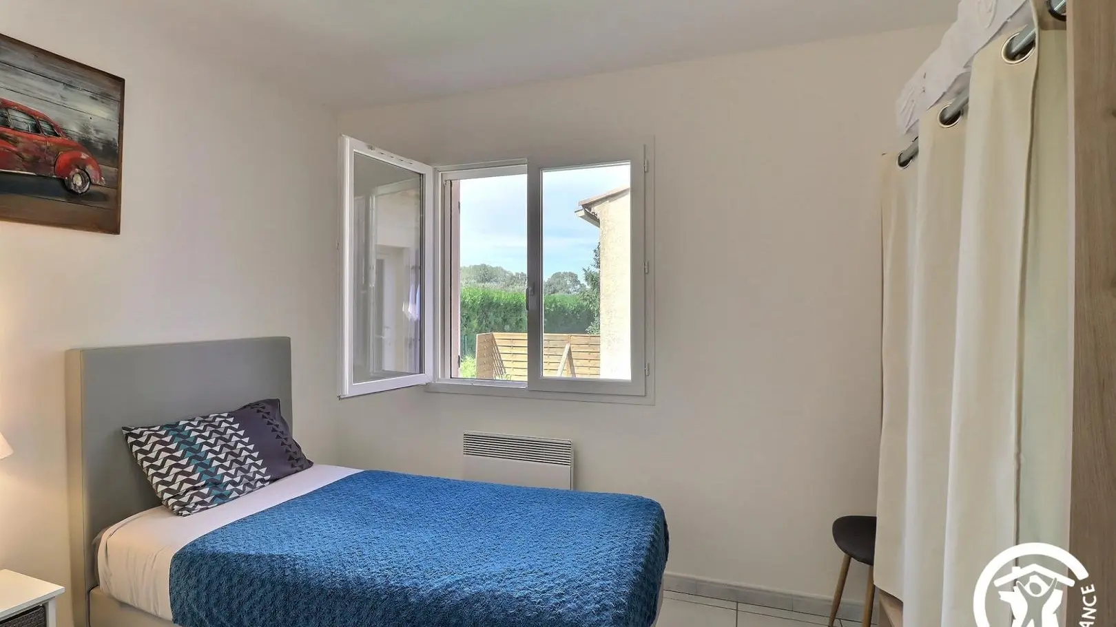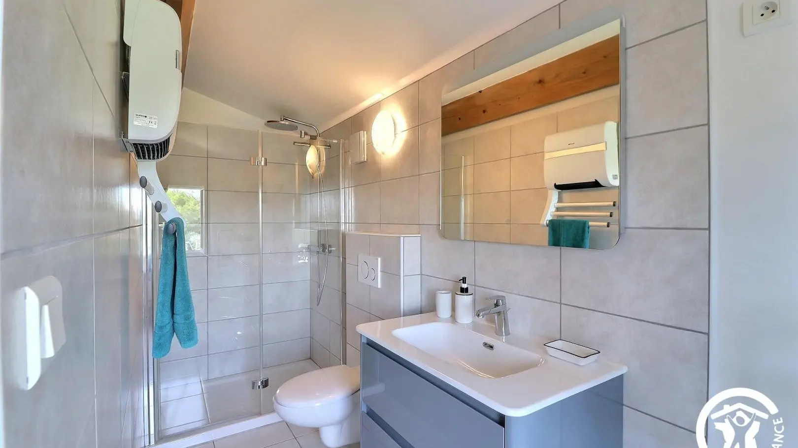 - Salle d'eau privative et attenante à cette chambre avec douche à l'italienne 80x120cm, WC, vasque, meubles de rangement et porte-serviettes. Décoration contemporaine, prestations de qualité. Espace extérieur privatif : terrasse d'environ 10 m² avec salon de jardin, espace avec gazon synthétique d'environ 100 m² avec bains de soleil et espace repas extérieur sous tonnelle, cour gravillonnée et jardin arboré commun avec les propriétaires d'environ 600 m². Garage privatif à disposition et parking possible sur la propriété fermée. 6 vélos à disposition, barbecue. Équipement bébé disponible à la demande : parc, chaise haute, lit parapluie... Chauffage électrique et climatisation réversible (inclus), draps et linge de toilette inclus, ménage de fin de séjour en option. Wifi.