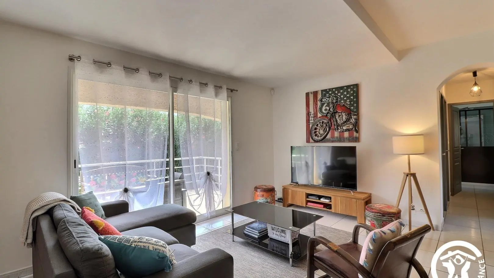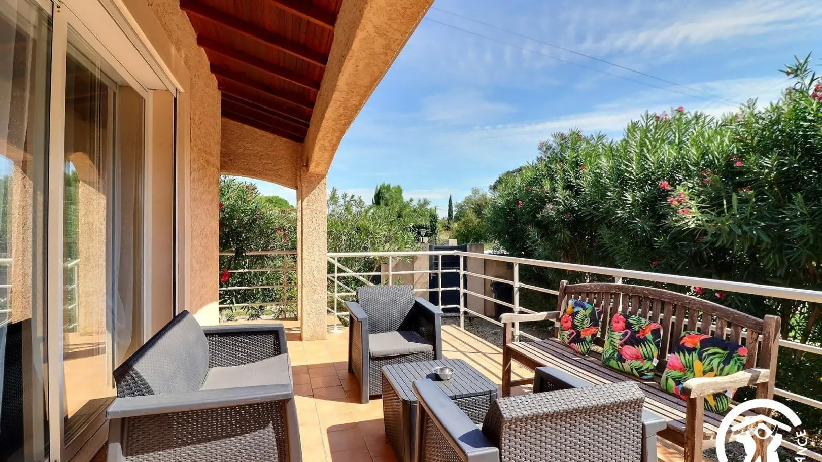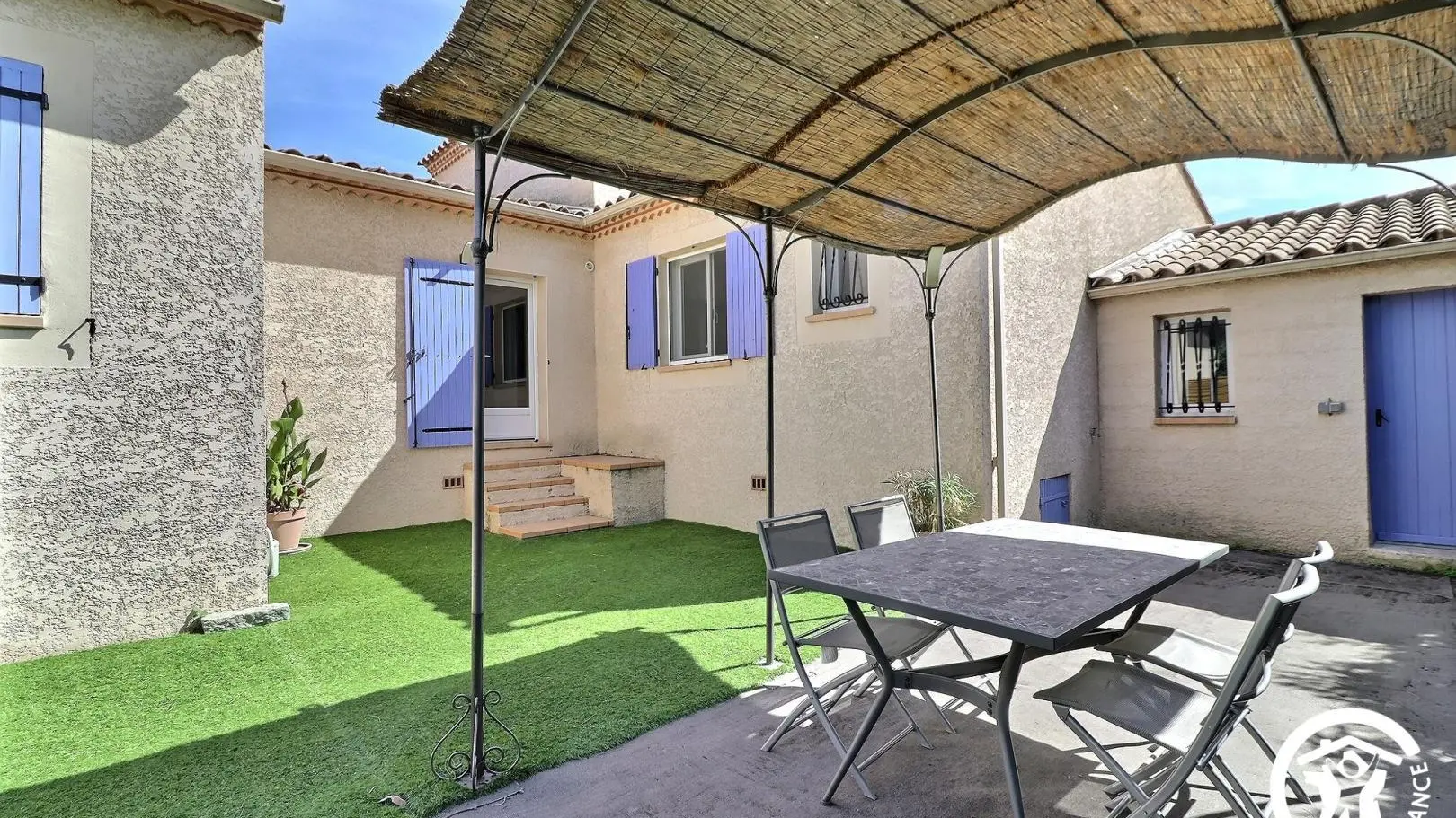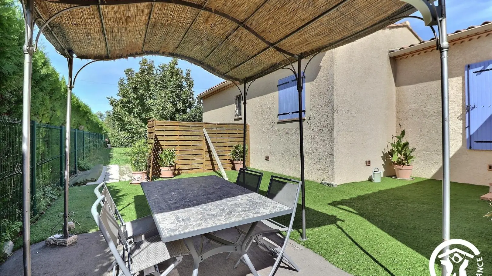 - Salle d'eau privative et attenante à cette chambre avec douche à l'italienne 80x120cm, WC, vasque, meubles de rangement et porte-serviettes. Décoration contemporaine, prestations de qualité. Espace extérieur privatif : terrasse d'environ 10 m² avec salon de jardin, espace avec gazon synthétique d'environ 100 m² avec bains de soleil et espace repas extérieur sous tonnelle, cour gravillonnée et jardin arboré commun avec les propriétaires d'environ 600 m². Garage privatif à disposition et parking possible sur la propriété fermée. 6 vélos à disposition, barbecue. Équipement bébé disponible à la demande : parc, chaise haute, lit parapluie... Chauffage électrique et climatisation réversible (inclus), draps et linge de toilette inclus, ménage de fin de séjour en option. Wifi.