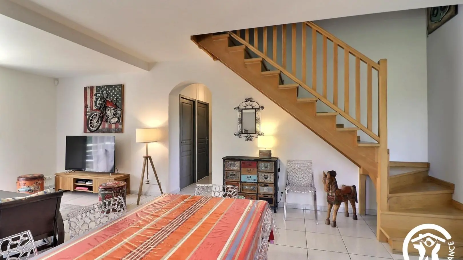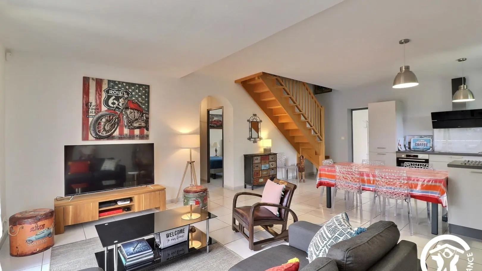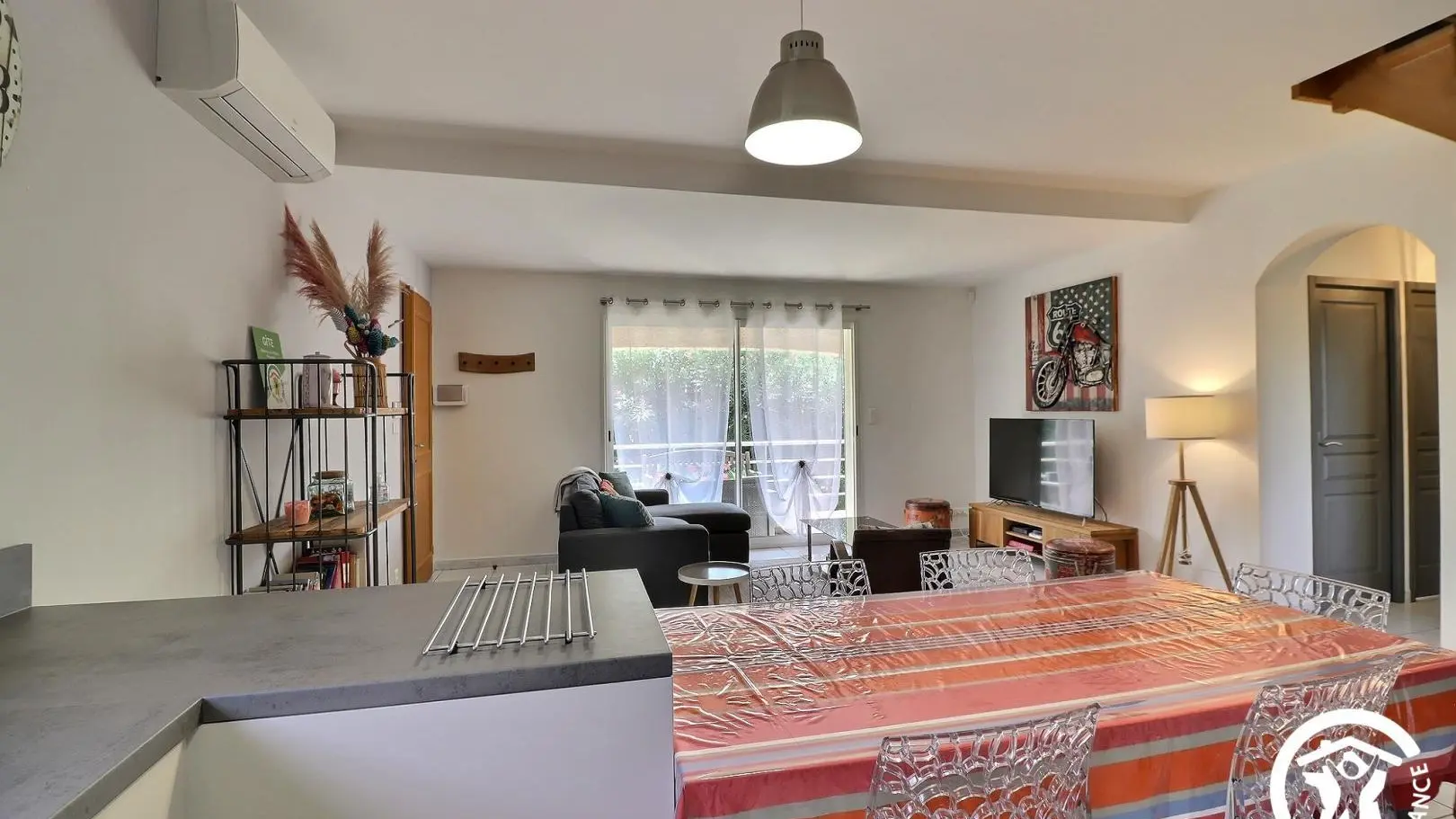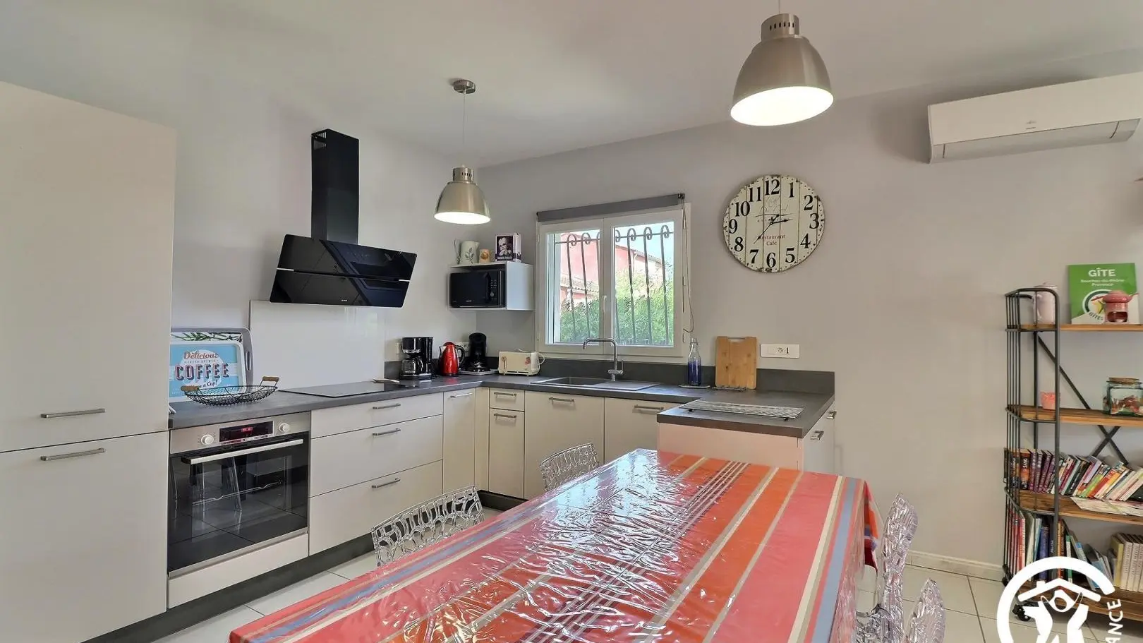 - Vaste séjour de 36 m² avec canapé d'angle, fauteuil, grande TV écran plat 140cm avec chaînes de la box Orange, climatisation réversible, espace repas pour 6 personnes. Cuisine entièrement équipée avec réfrigérateur/congélateur, plaque 3 feux induction, hotte, four, micro-ondes, lave-vaisselle, cafetière à dosettes Senseo.