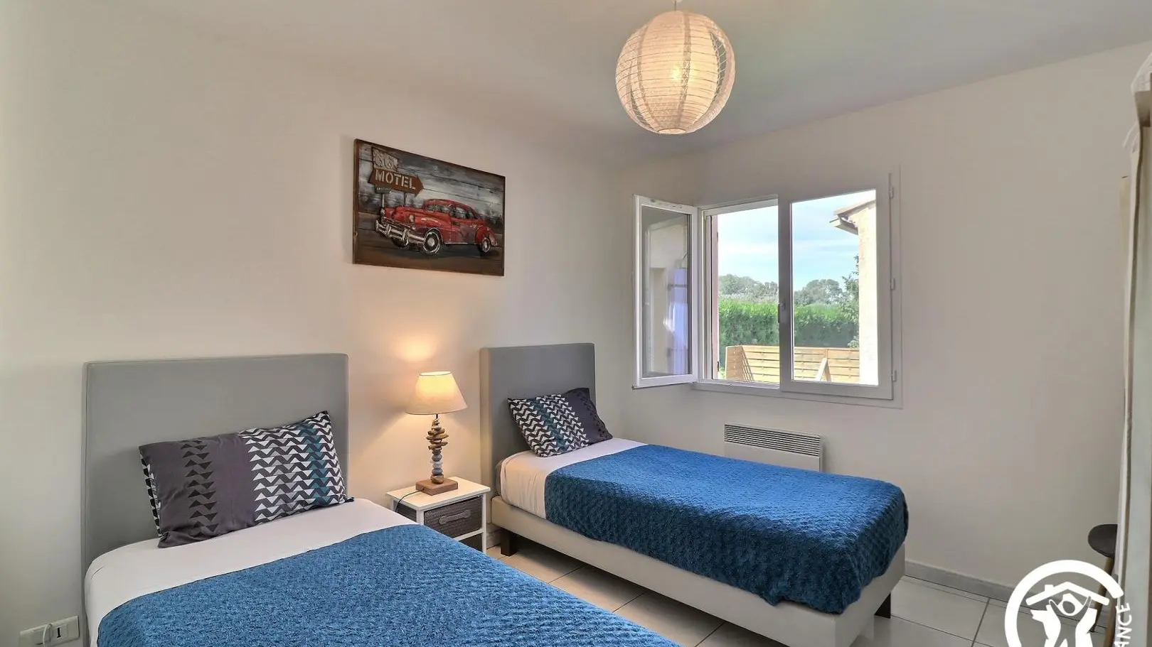 - Une 1ère chambre avec 2 lits 1 personne 90x190cm et armoire.