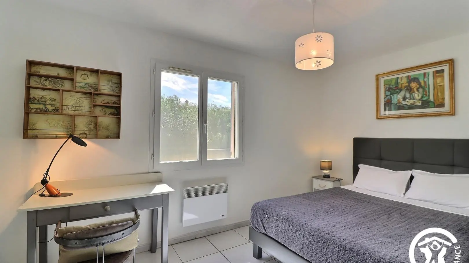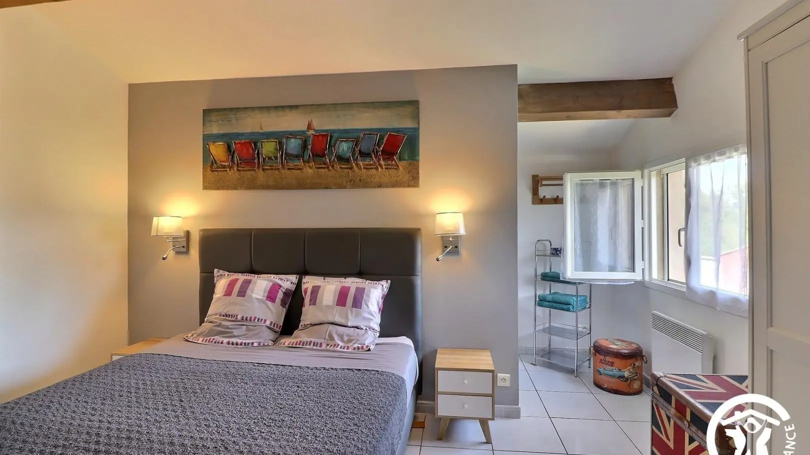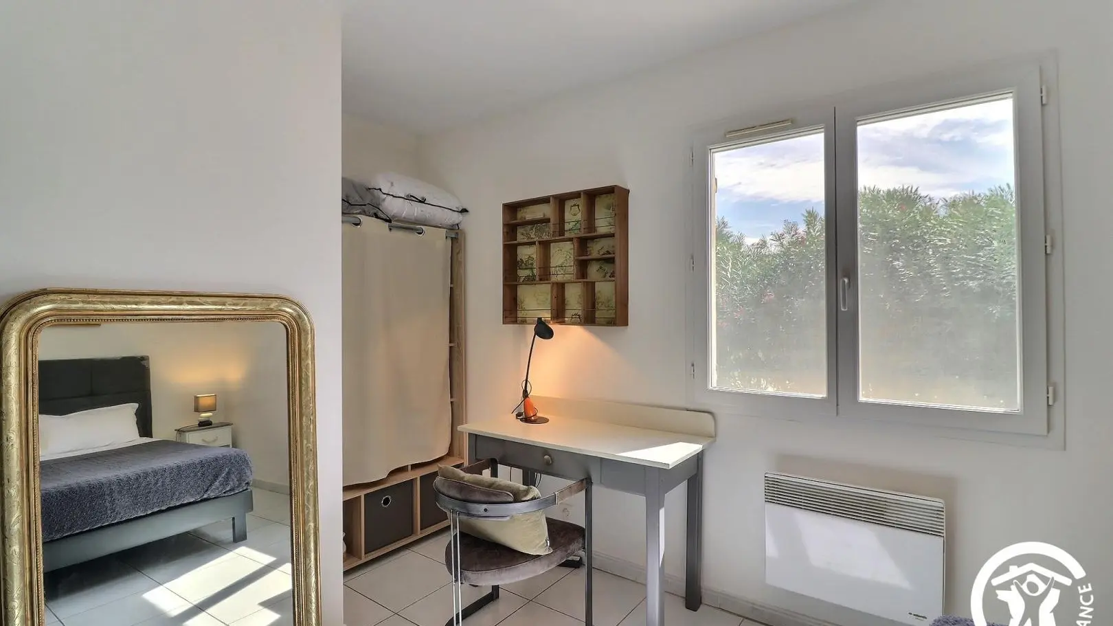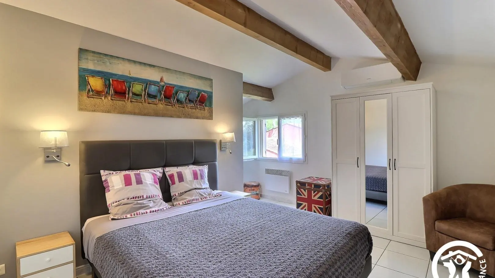 - 3ème chambre avec 1 lit 2 personnes 160x200cm, fauteuil, armoire, malle et meuble bas. Climatisation réversible.