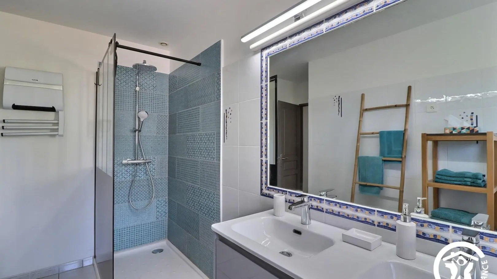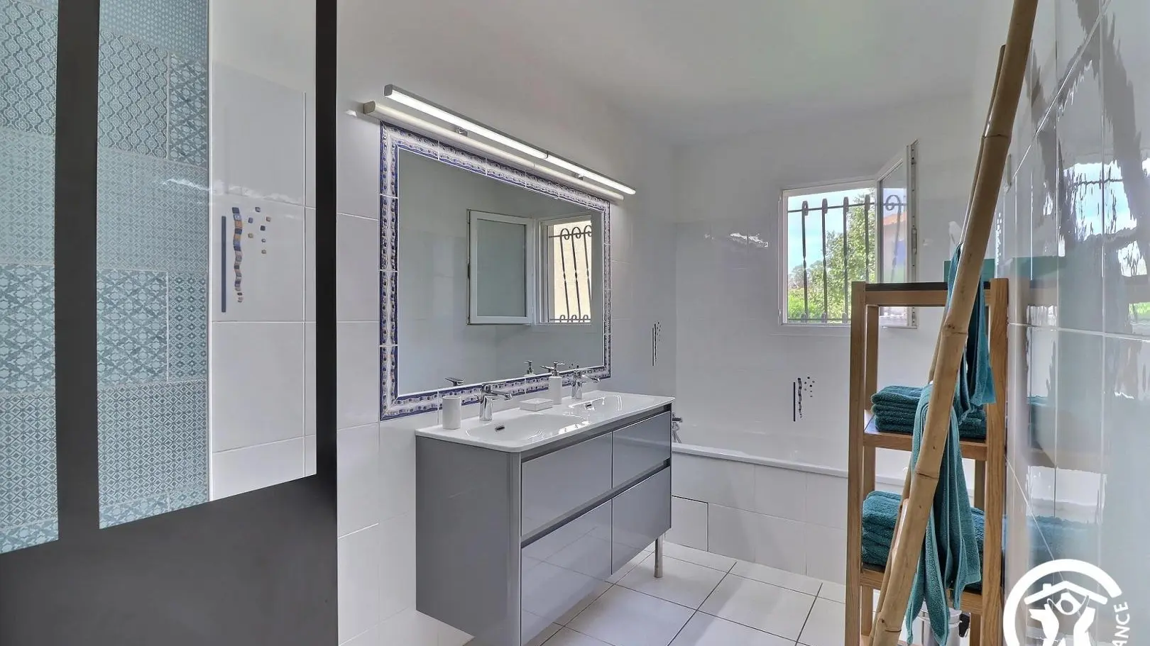 - Grande salle de bain avec baignoire et douche à l'italienne 80x120cm, double vasque, meubles de rangement et sèche-serviettes.