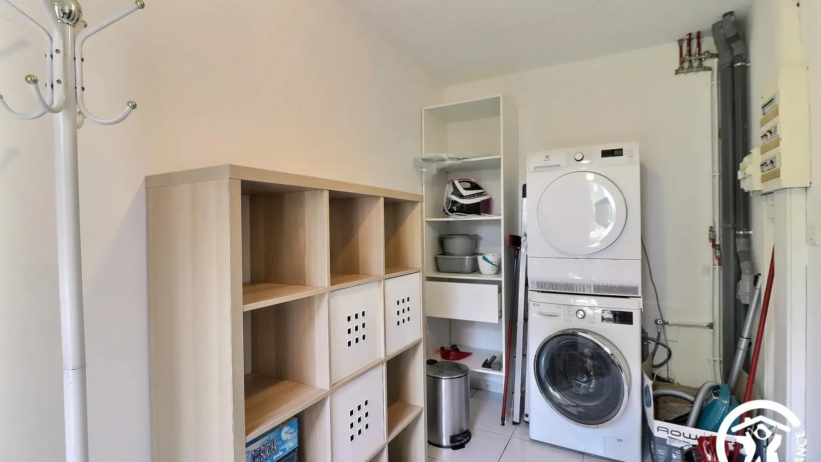 - Buanderie avec lave-linge, sèche-linge, jeux de société et ustensiles de ménage. A l'étage :
