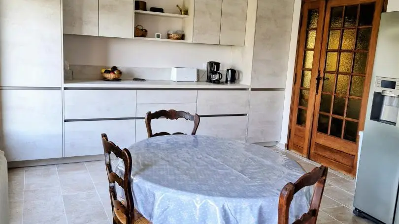 - salle de bain/WC avec baignoire - cuisine : plaque 3 feux induction, hotte aspirante, four, micro-ondes, lave-vaisselle, lave-linge, réfrigérateur américain, buffet, petit espace repas. La cuisine ouvre sur une terrasse côté nord.