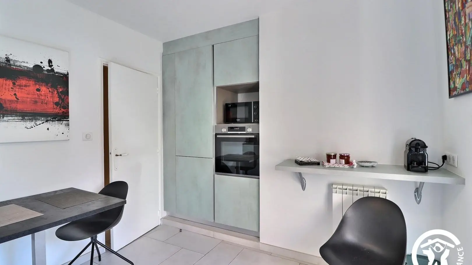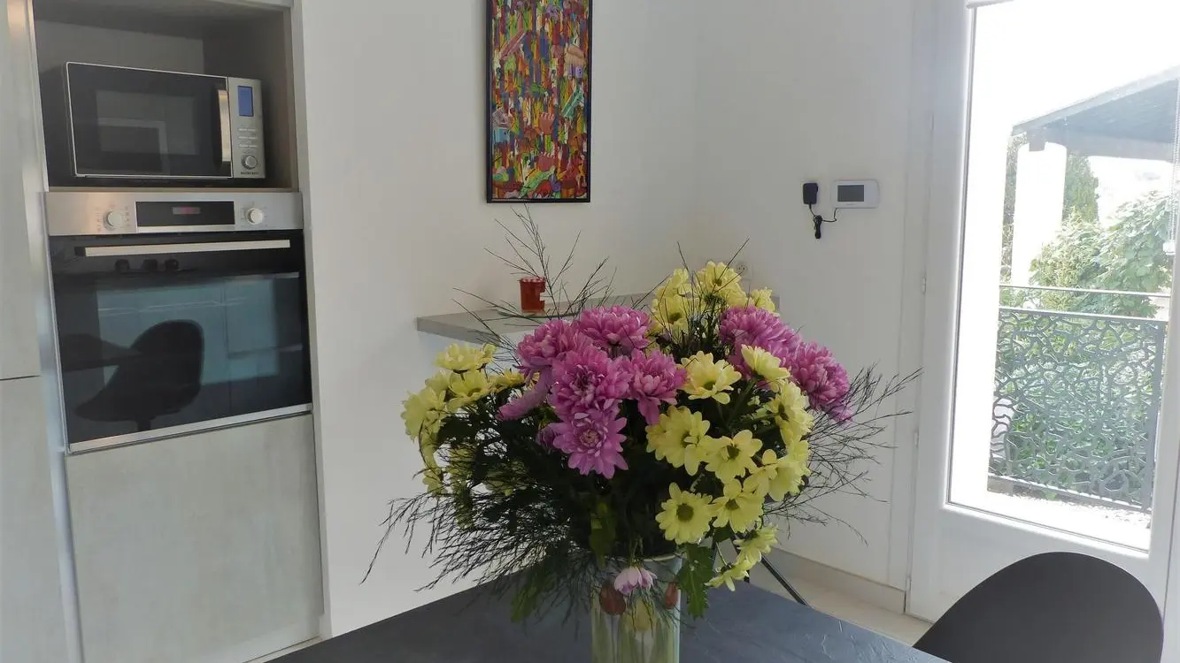 •Cuisine indépendante avec petit espace repas, entièrement équipée : plaque 3 feux induction, hotte, four, micro-ondes, lave-vaisselle, réfrigérateur/congélateur...