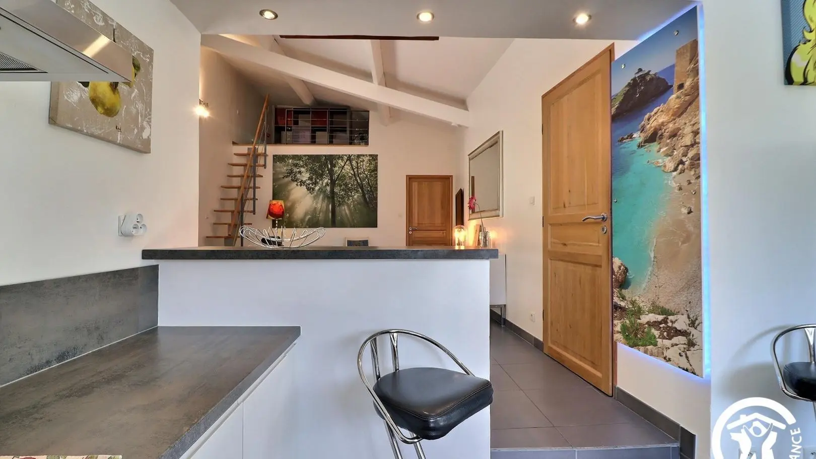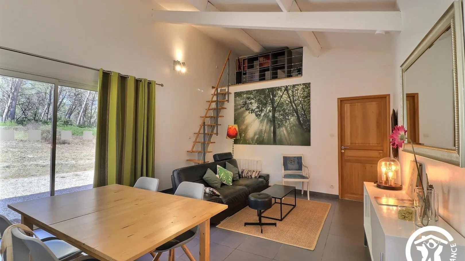 - Salon climatisé lumineux avec espace repas pour 6 personnes, canapé, fauteuil, table basse, TV TNT. Mezzanine sous les toits accessible par escalier meunier, avec un matelas 140x190 cm et rangements.