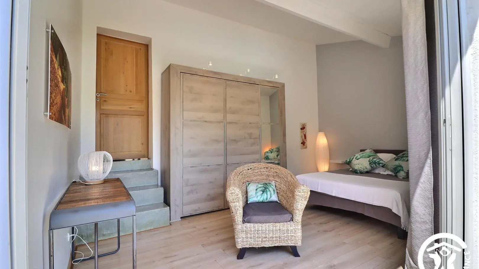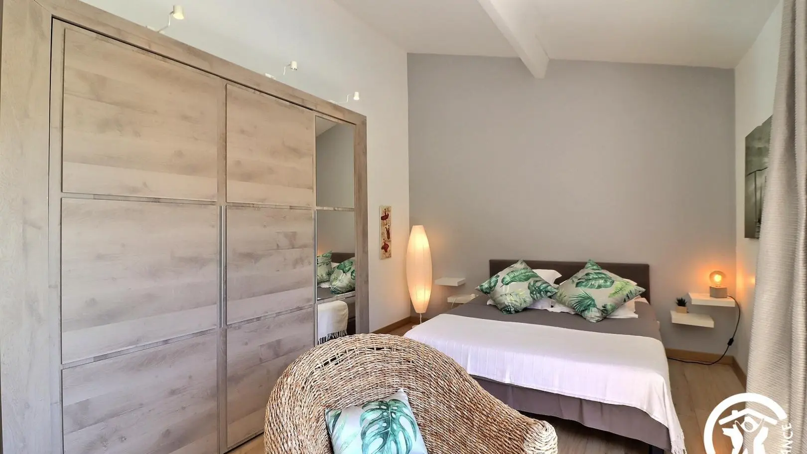 - Chambre principale avec lit 160x200 cm, penderie, fauteuil, console, porte-fenêtre donnant sur l'extérieur.