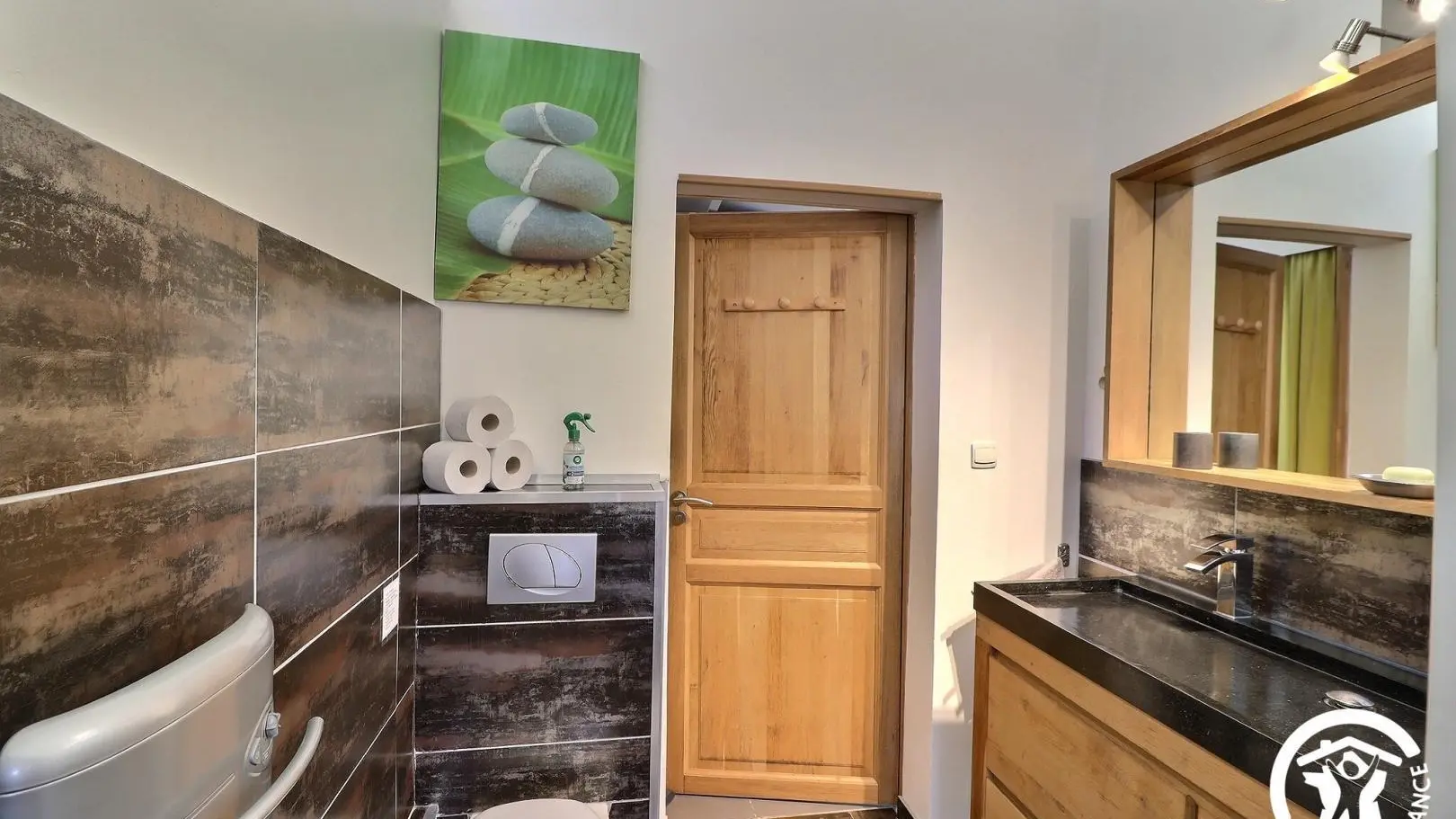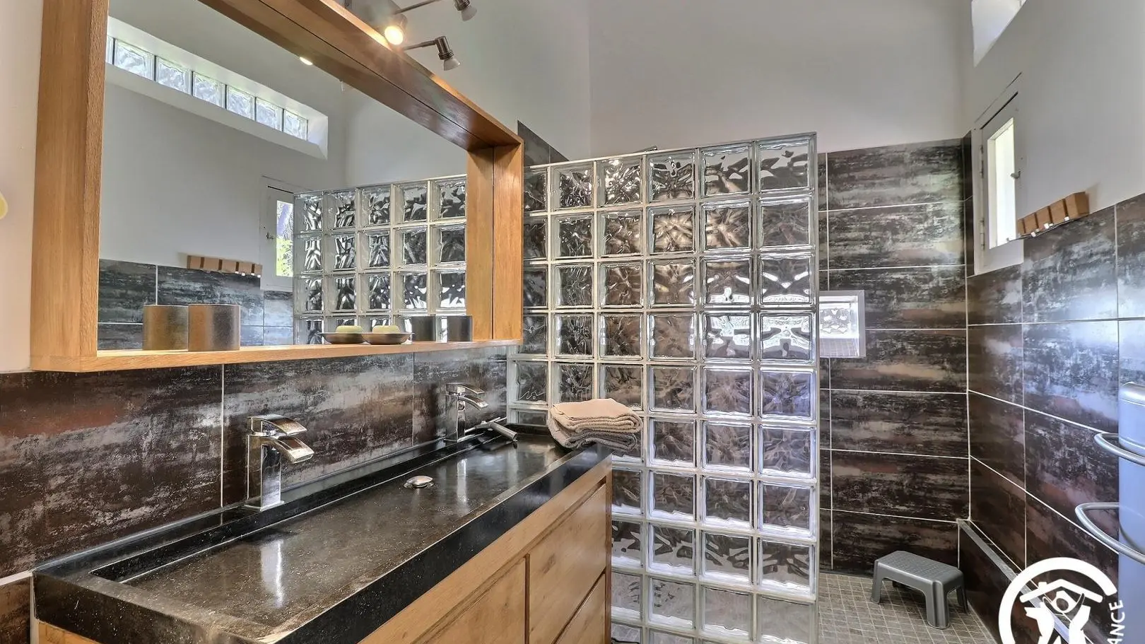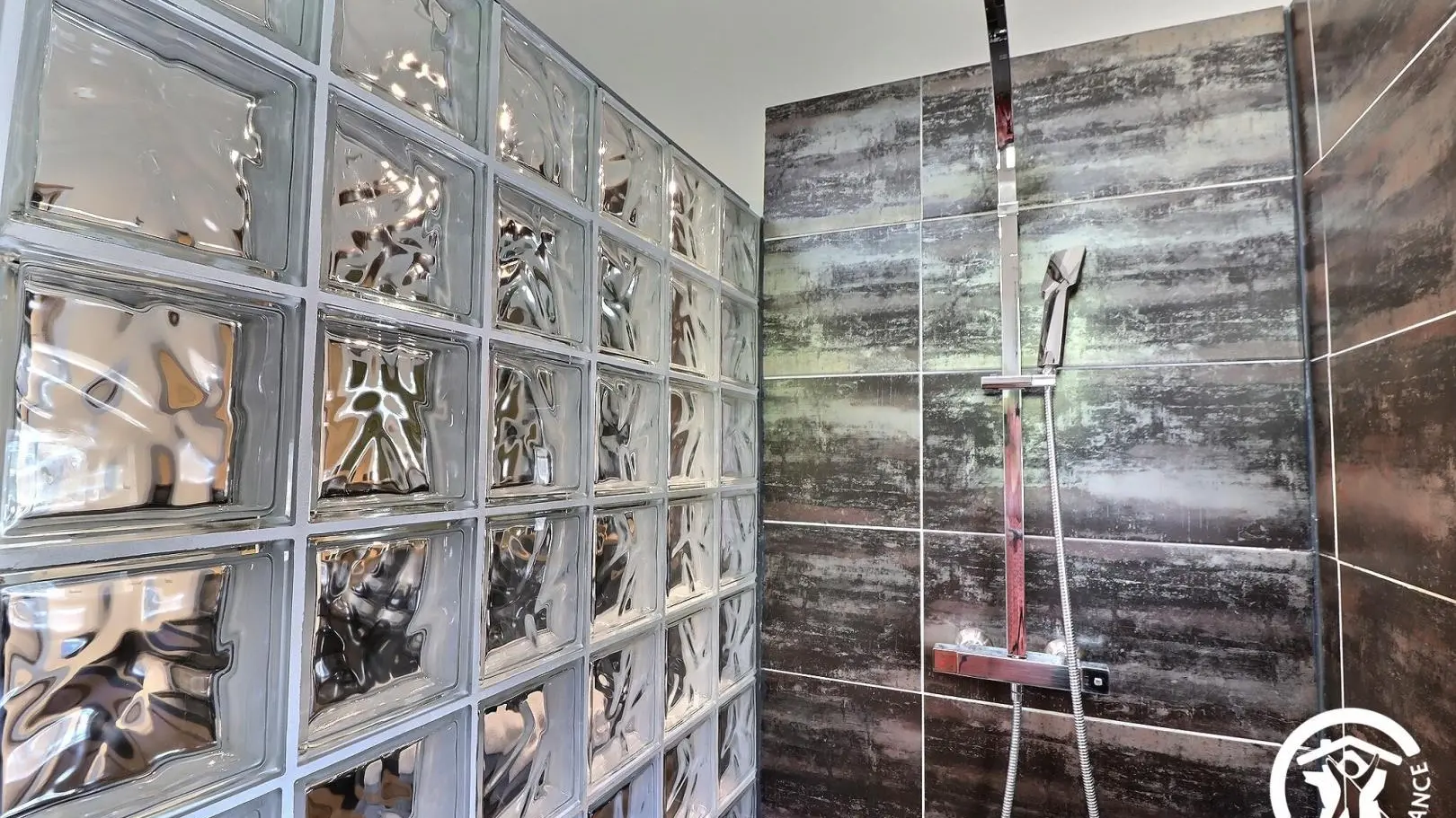 - Salle d'eau moderne avec douche à l'italienne, double vasque, meuble de rangement, sèche-serviettes et WC suspendu.