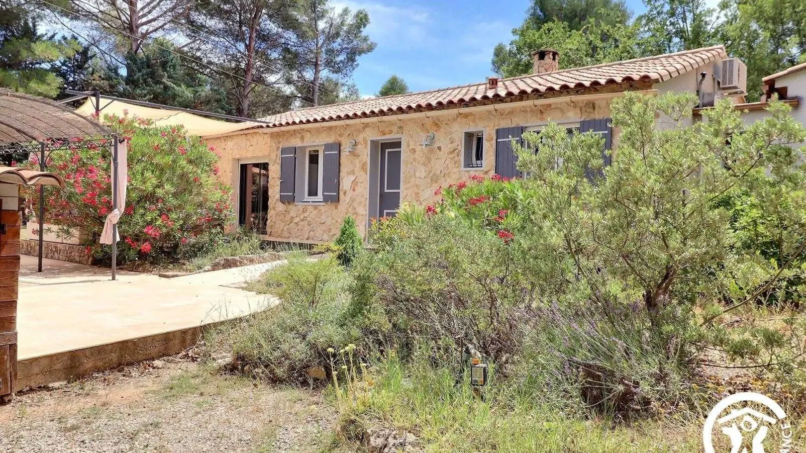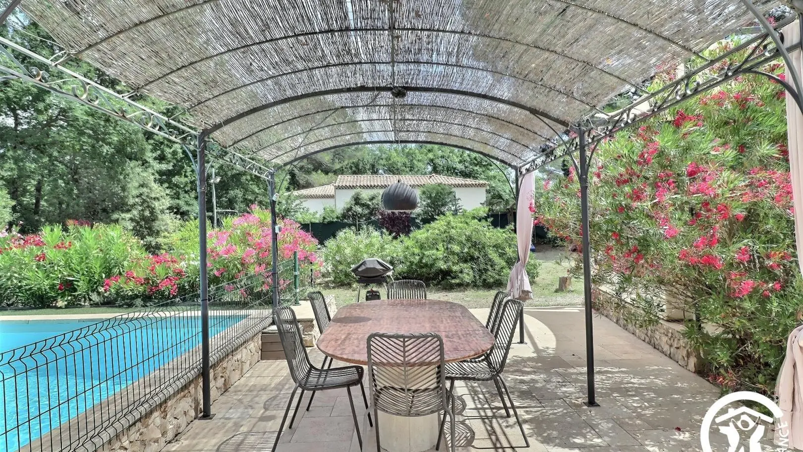 Entièrement de plain-pied, la maison s'ouvre côté nord sur deux belles terrasses ombragées et un jardin arboré : séjour/salon (climatisée)lumineux (orienté sud) avec deux canapés, télévision écran plat, et chaîne hi-fi, poële à foyer fermé (bois gratuit). Espace cuisine intégrée avec plaque vitrocéramique (2 feux), lave vaisselle, four,micro ondes, frigo/congélateur.