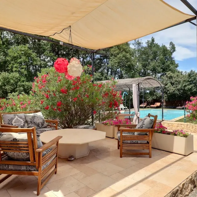 En pleine campagne entre Aix en Provence et Salon de Provence, sur un terrain entièrement clôturé et boisé (chênes et pins), gîte sans vis à vis disposant de 2000 m² d'espace extérieur et de sa piscine privative sécurisée (10x5 - profondeur 1.3 m à 2.4m). Deux terrasses avec salon de jardin et salon détente, espace sous les chênes avec hamac.