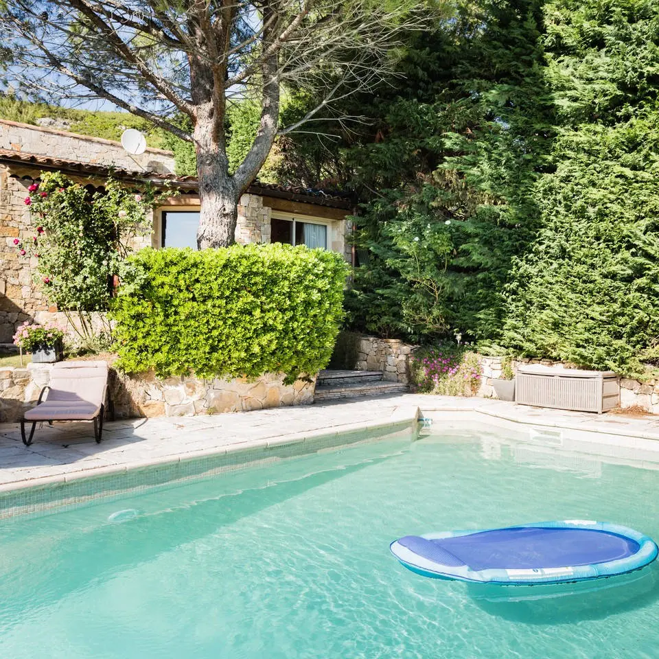 A 15 mn d'Aix en Provence et 30 mn du Luberon et des Alpilles, maisonnette individuelle en pierre de 55 m², climatisée et décorée avec goût, située sur le terrain des propriétaires au bord de la piscine de 9x5 m et à flanc de colline. Grand séjour/salon de 35 m² avec poutres apparentes. Cuisine américaine entièrement équipée. Salle d'eau avec WC. A l'étage : 1 chambre de 15 m² avec 1 lit/2 pers (160x200) + 1 lit/1 pers. Terrasse avec mobilier de jardin. Linge de maison inclus. Possibilité de découverte oenologique.