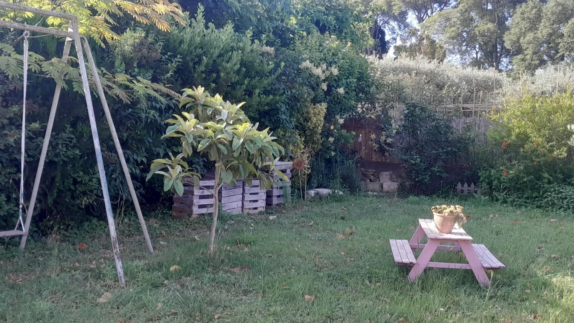 Terrasse et jardin privatifs d'environ 400 m² avec plusieurs salons de jardin, bains de soleil. Jeux pour enfants : portique, cabane.