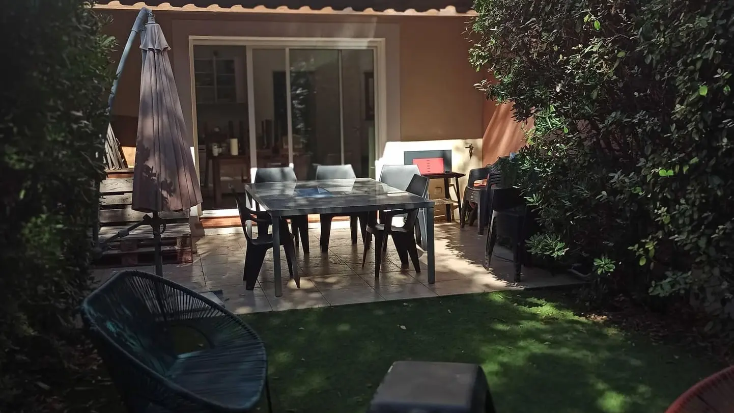 Au rez-de-chaussée, vous pourrez profiter d'un séjour ouvert sur une cuisine, tout deux donnant sur une terrasse ombragée et un petit jardin privatif. Au même niveau de la maison, vous trouverez une chambre (lit de 140) attenante à une salle de bain comprenant douche, lavabo et WC.
