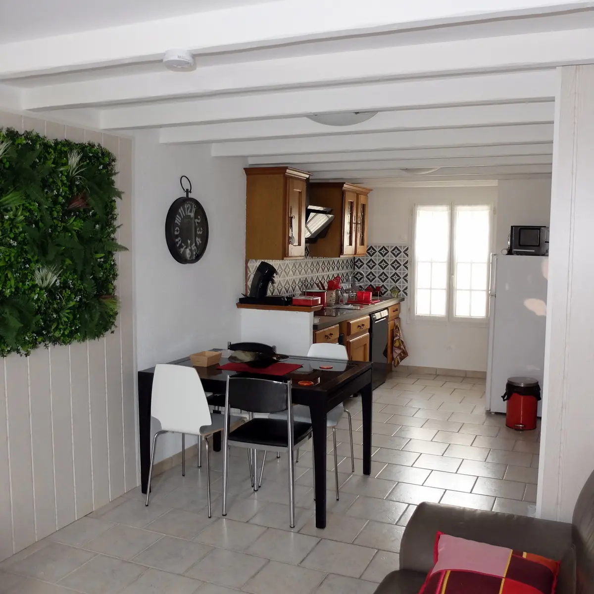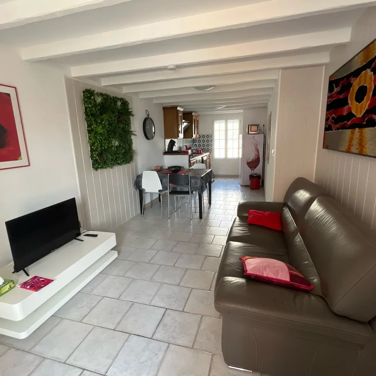 Comporte au rez de chaussée une grande pièce à vivre avec cuisine ouverte, salon avec canapé 3 places et Tv, wc.