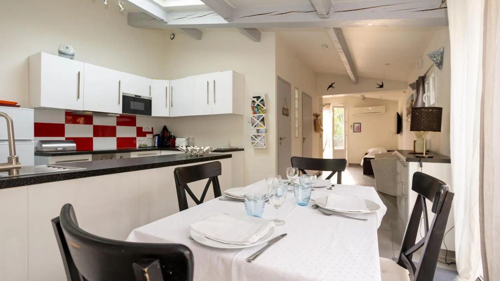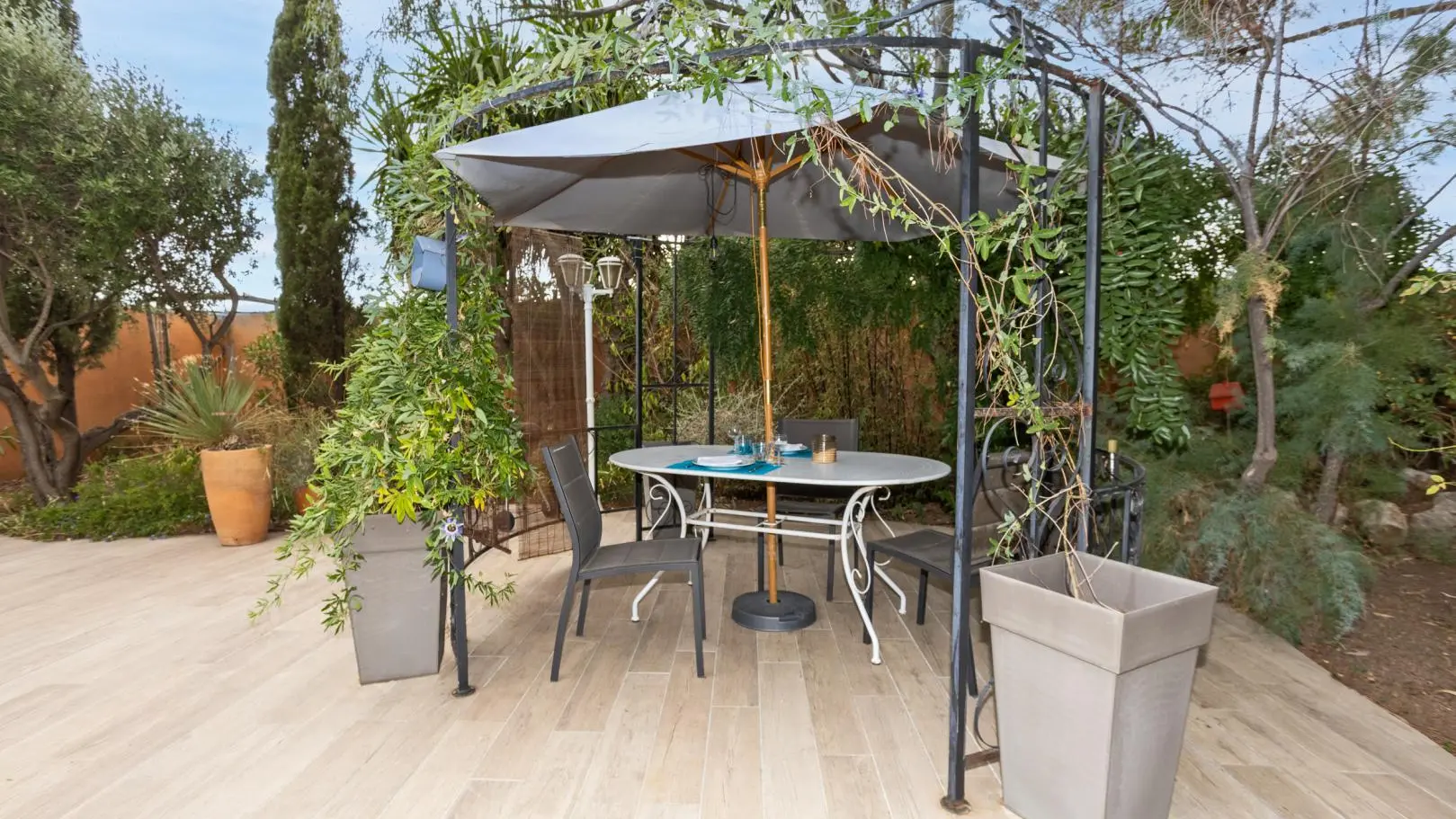 A l'extérieur, une terrasse accessible par le côté cuisine, avec table et fauteuils pour le petit déjeuner du matin, et un autre espace au bord de la piscine, sous la gloriette ombragée, avec barbecue.