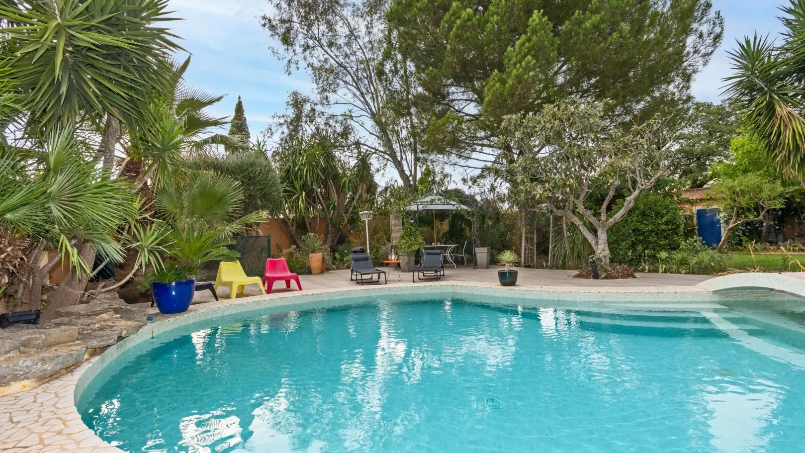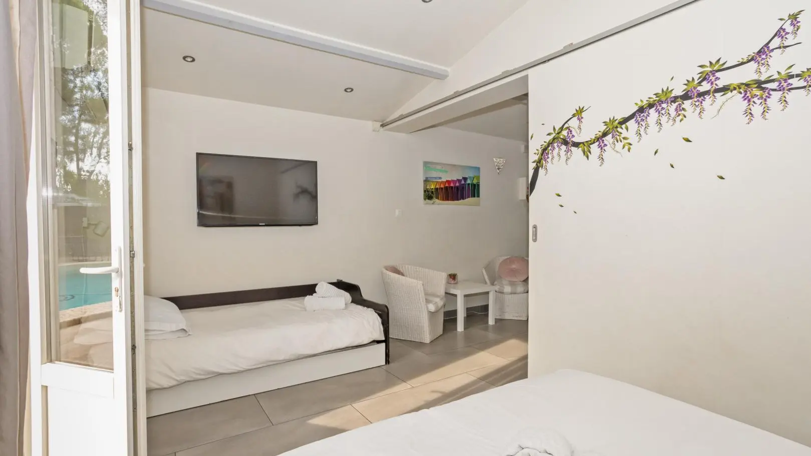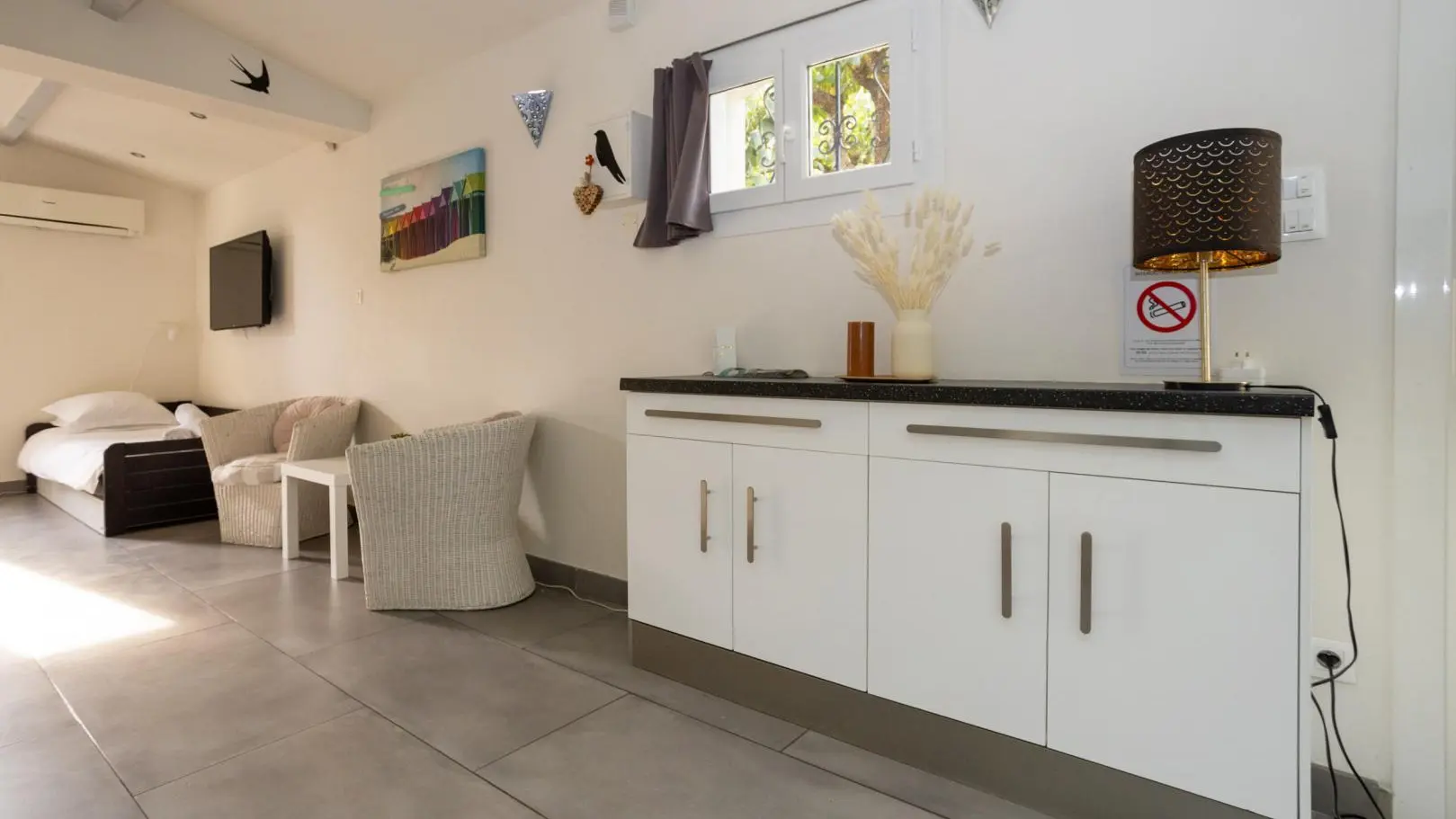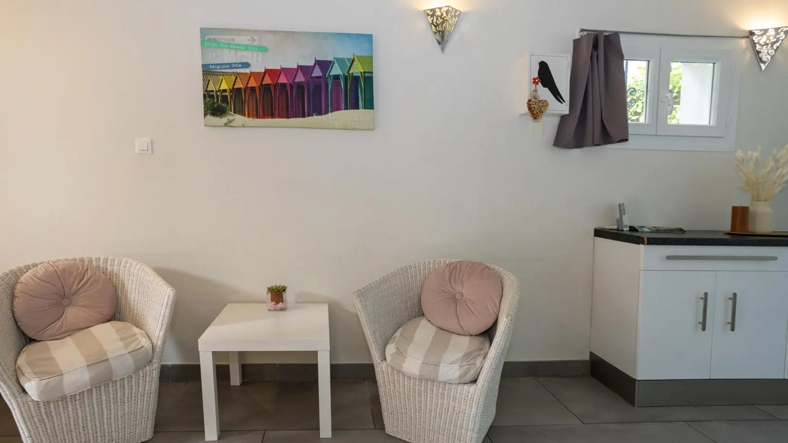 Ménage, draps et linge de toilette sur demande (pack 70€). Équipement bébé sur demande (lit parapluie, chaise haute, baignoire, transat). Hors saison, séjour possible à partir de 2 nuitées . Lit supplémentaire sur demande (supplément). Piscine commune accessible (sauf le dimanche), sécurisée, grand jardin méditerranéen avec espaces fleuris et ombragés.