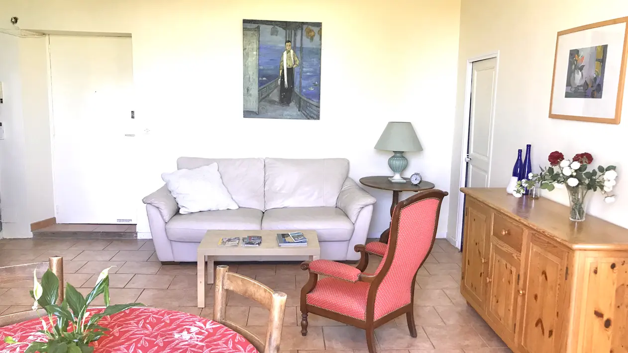 Cet appartement comprend une chambre avec un lit double (140cm), un séjour équipé d’un canapé avec un grand dressing attenant, une cuisine entièrement équipée (plaque de cuisson à induction, frigo-congélateur, micro-ondes, grille pain et cafetière) et une salle de bain avec douche, lave-linge et WC.