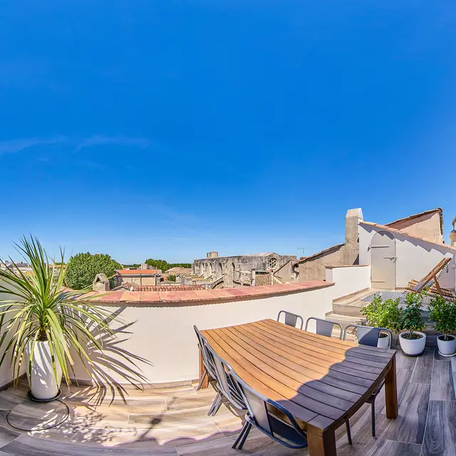 Au coeur du centre historique entre la place du Forum, les Thermes de Constantin et la Fondation Van Gogh, il occupe les deux derniers étages d'un immeuble chargé d'histoire. L'appartement est idéalement situé pour visiter les musées et monuments, profiter du centre, de ses commerces et restaurants. L'appartement est calme et lumineux. La terrasse domine les toits d'Arles sans aucun vis-à-vis pour une vue époustouflante sur l'Église des frères Prêcheurs, les Aliplles et le Rhône. Il a été entièrement rénové et désigné par la scénographe Julie Reilles avec une décoration ethnique chic.
