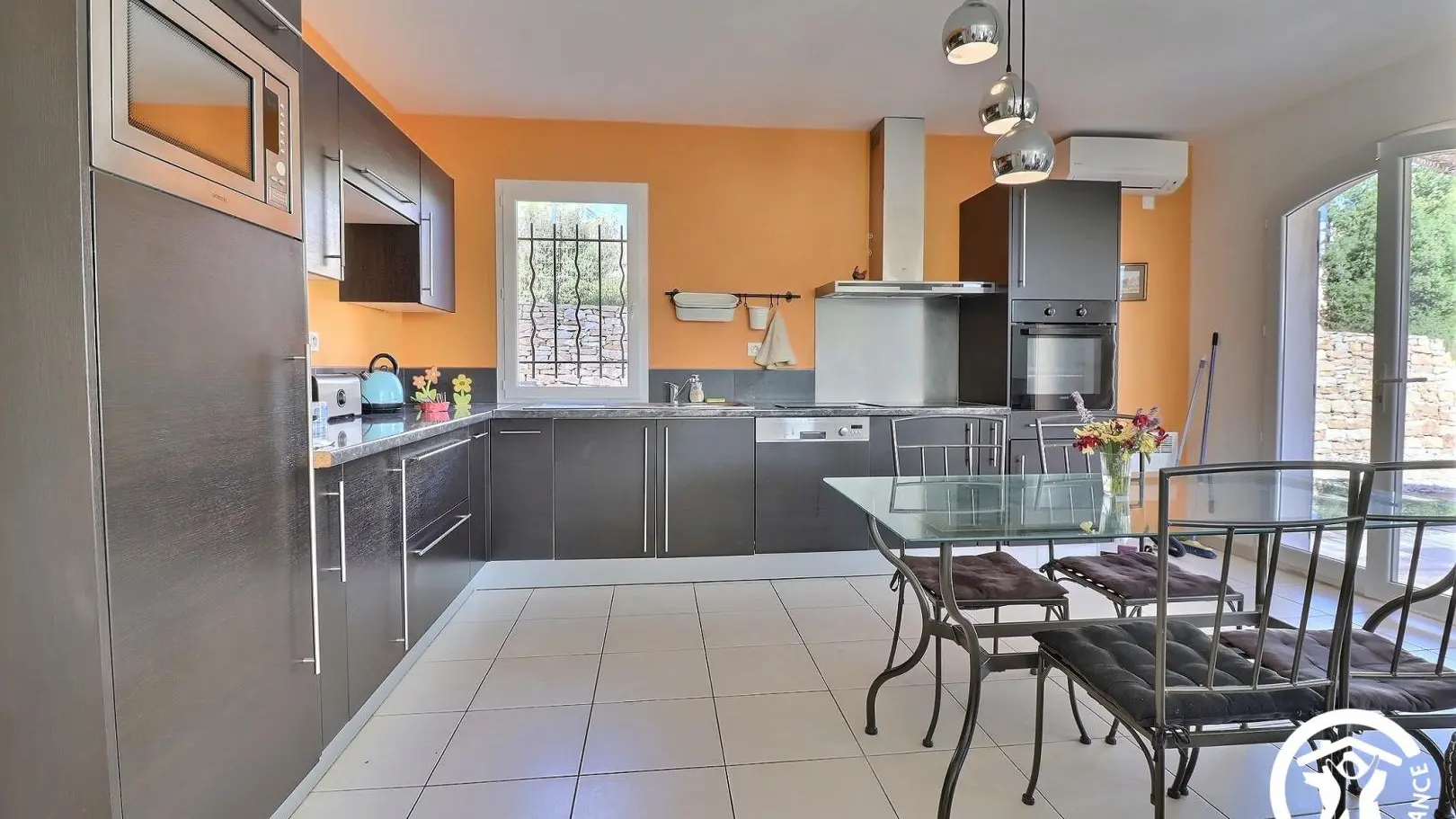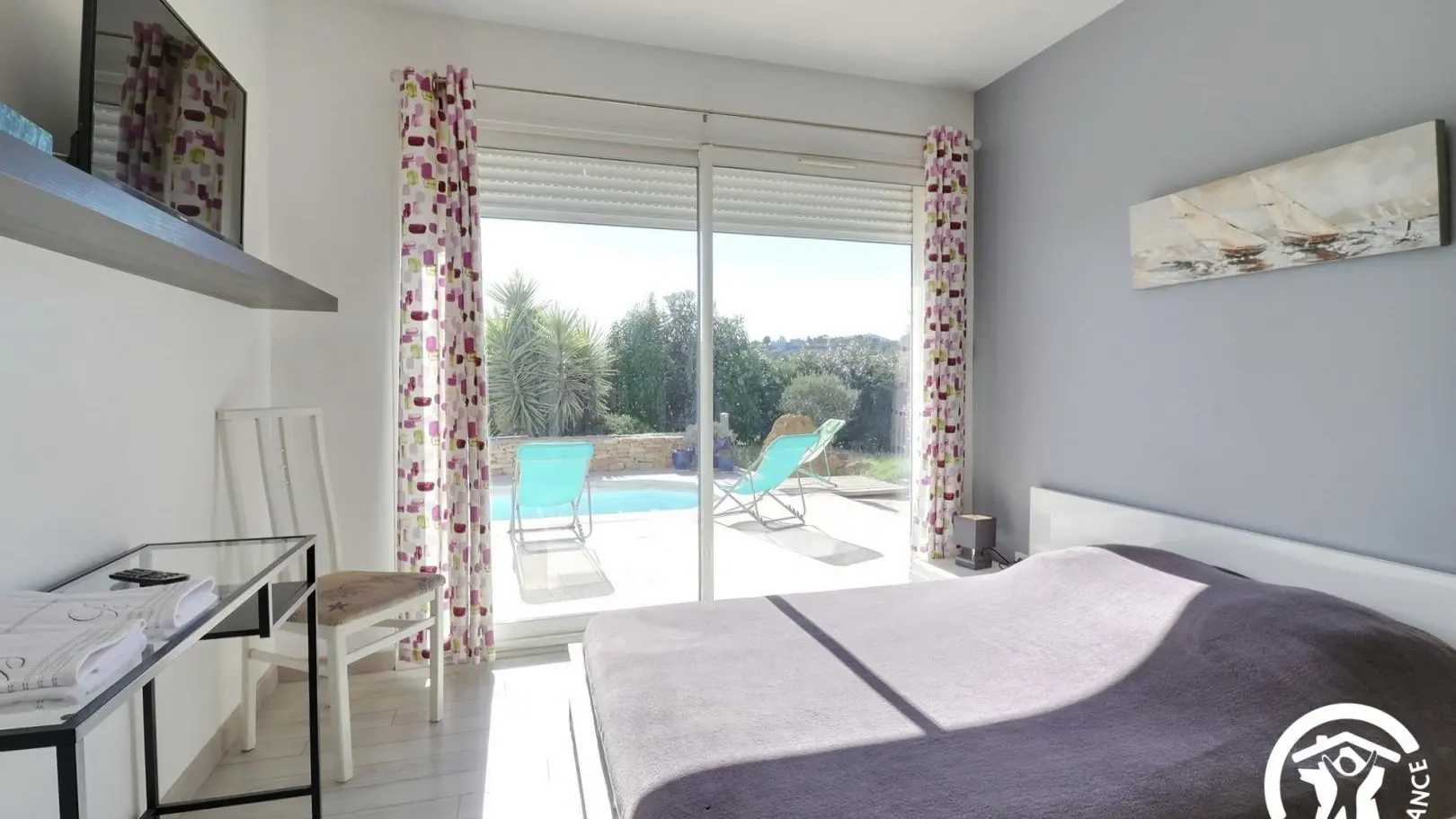 Sur les hauteurs de La Ciotat avec vue sur la mer, le gîte Vent du Cap est une maison indépendante pour 8 personnes avec terrasse, petite piscine privative (4 x 2.50 m, profondeur 1.20 m) et joli jardin arboré, à seulement 2km de l'autoroute A50. Idéal pour un séjour proche de la nature, de la mer, des randonnées dans les calanques, en toute déconnexion. L'entrée dans la maison se fait par une belle terrasse ombragée de 40m². Au rez-de-chaussée, une grande pièce de vie avec cuisine ouverte intégrée : lave-vaisselle, four, micro-ondes, réfrigérateur, 3 feux vitrocéramique, hotte aspirante, lave-linge. Table et chaises. Salon avec canapés en cuir, table basse et TV. Chambre avec baie vitrée sur la piscine, lit 140x190cm, penderie et rangements, TV. Salle de bain avec baignoire et pare-douche, vasque et sèche-serviettes. WC indépendant.