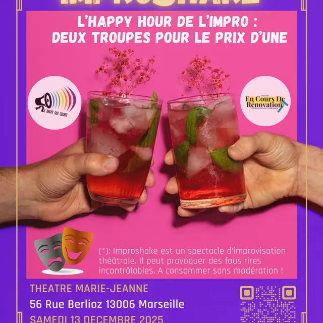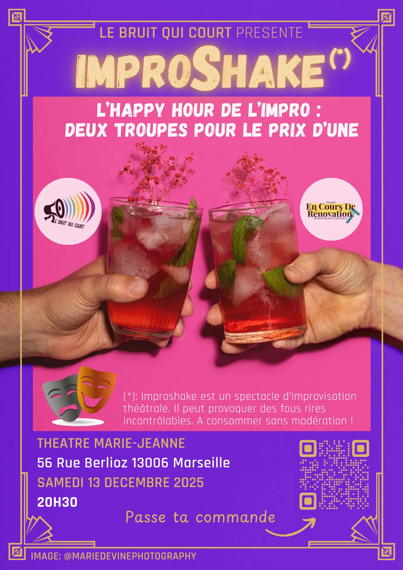 Le Bruit Qui Court invite la troupe d'improvisation avignonnaise En Cours de Rénovation pour une rencontre sous le format ImproShake ! Conçu et proposé par le Bruit Qui Court, il s'agit du cocktail de deux troupes qui se mélangent sur scène pour un spectacle improvisé où tout peut arriver, surtout la folie !