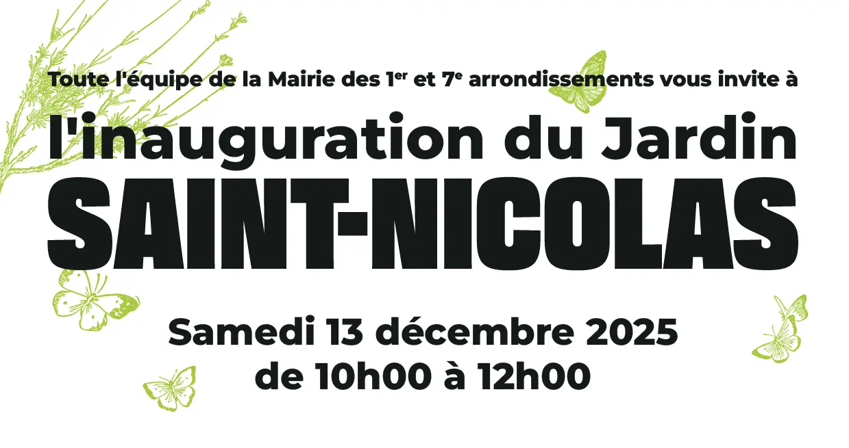 Toute l'équipe de la Mairie des 1er et 7 arrondissements vous invite à l'inauguration du Jardin Saint-Nicolas samedi 13 décembre 2025.