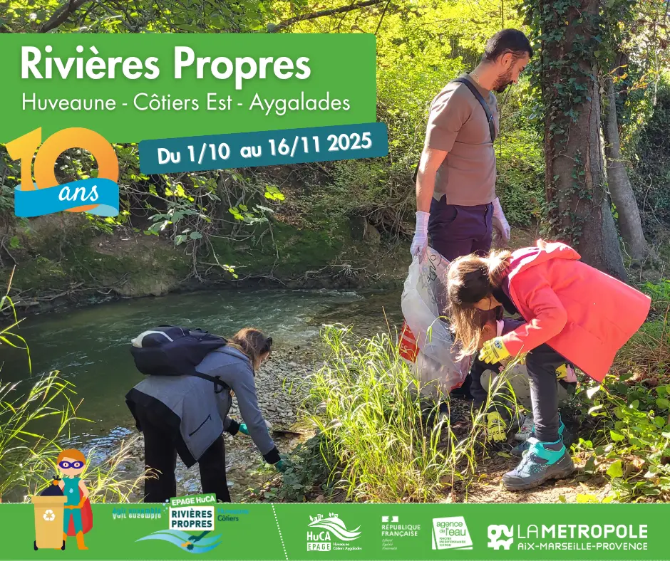 Cette dixième édition de l’opération Rivières Propres aura lieu du 1er octobre au 16 novembre 2025. Les opérations de ramassage de déchets se dérouleront le long de l’Huveaune, du Jarret, des Aygalades, et de bien d’autres cours d’eau du territoire de l’EPAGE HuCA. Dates définitives par commune à venir sur cette page.