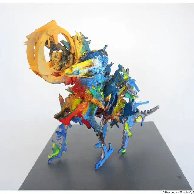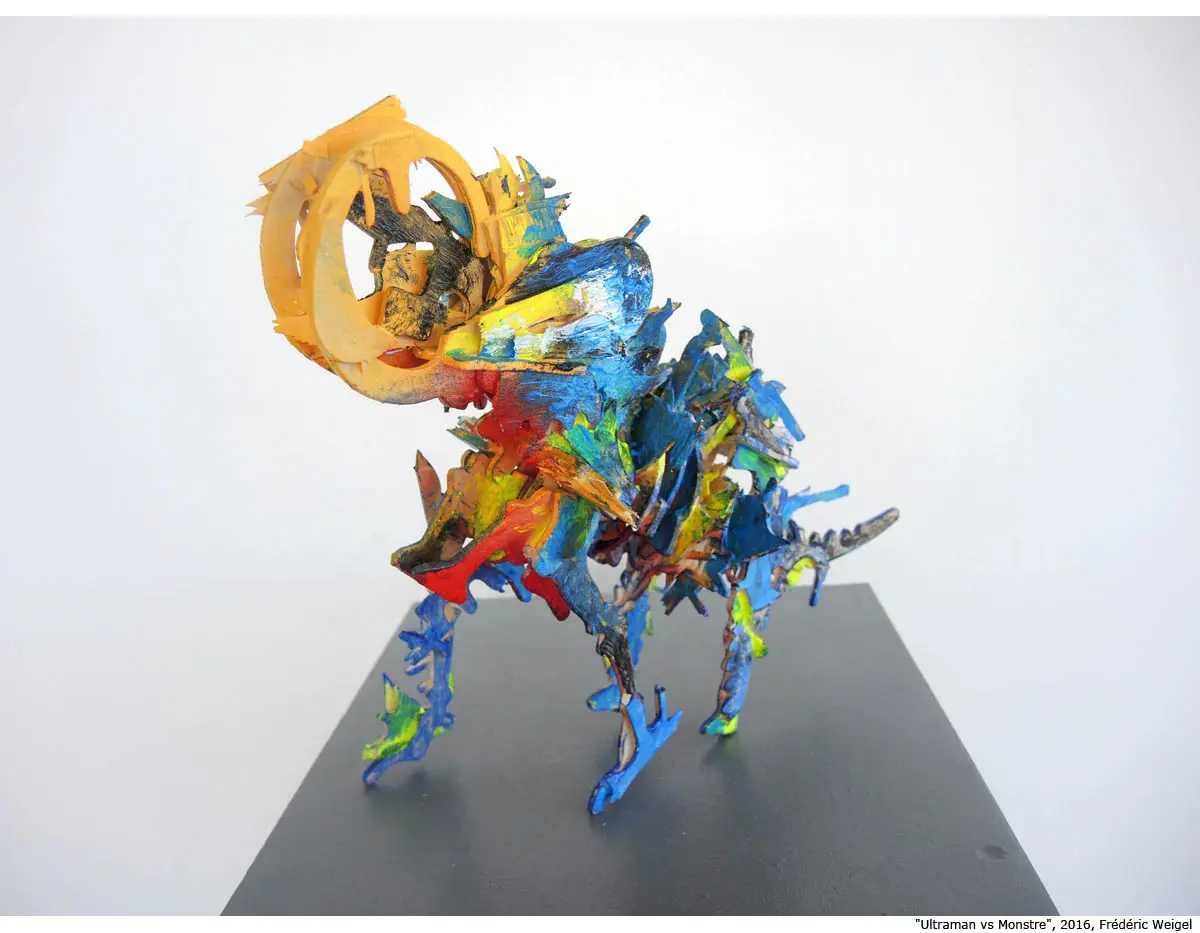 Pour ma part, le reflet que je perçois dans la série Ultraman prend la forme d’une régression enfantine. Je fus très tôt marqué par une peinture de Saint Michel terrassant le dragon dans la petite église de mon village natal. Malgré mes efforts, je ne peux m’extraire d'un transfert inconscient qui vient soutenir la fascination que j'éprouve face à ce sur-homme qu'est l'archange Ultraman. L’ambiguïté de la représentation de l'altérité repose sur le fait que cette incarnation renvoie à des mondes imaginaires brouillant inévitablement toute visée initiale. On croit atteindre l'autre et on ne fait que se perdre dans une croyance narcissique qui s'objective dans le labyrinthe des reflets et des jeux d’eau.